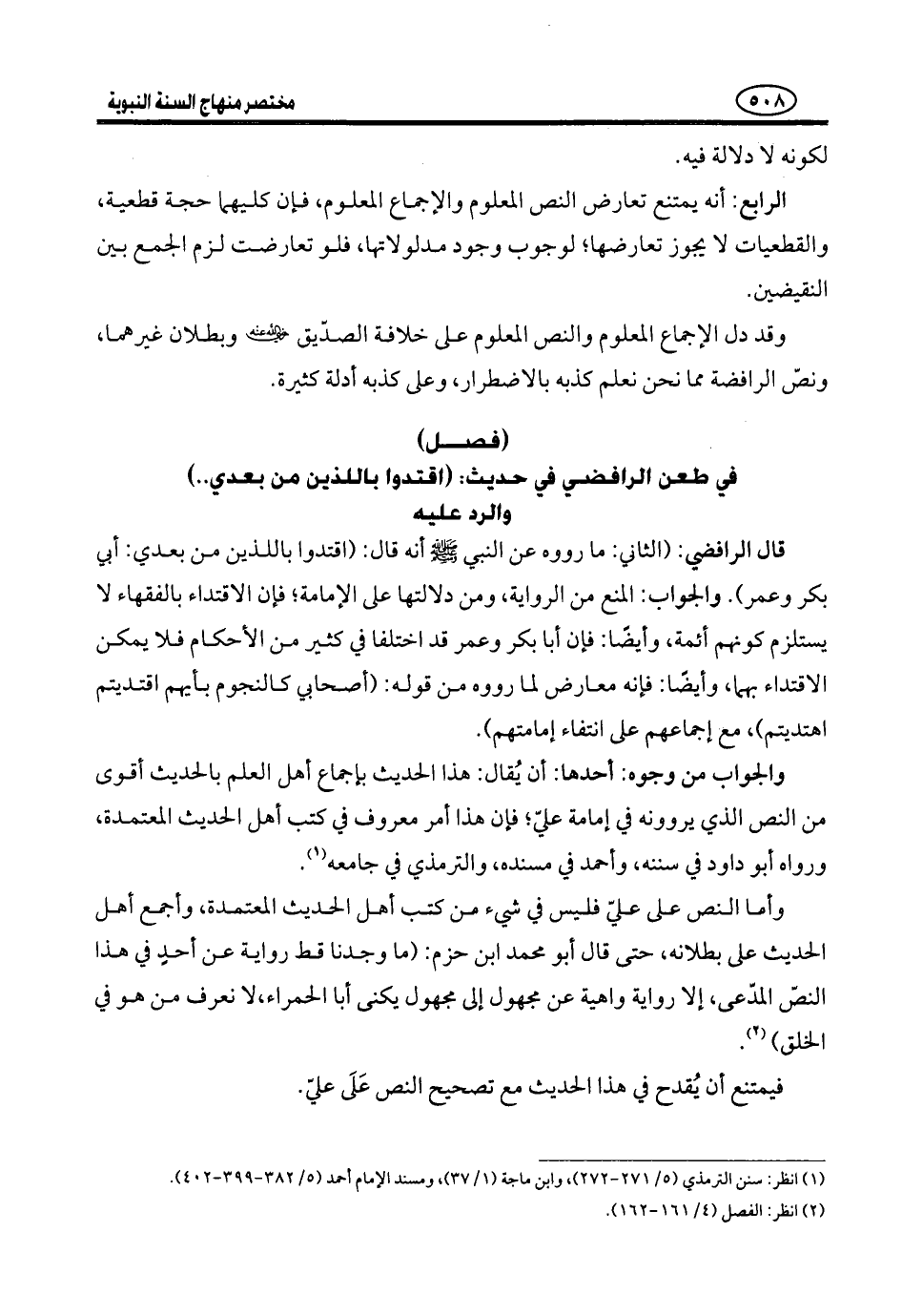 وَأَمَّا الدَّلَالَةُ، فَالْحُجَّةُ فِي قَوْلِهِ: ((بِاللَّذَيْنِ مِنْ بَعْدِي)) أَخْبَرَ أَنَّهُمَا مِنْ بَعْدِهِ، وَأَمَرَ بِالِاقْتِدَاءِ بِهِمَا. فَلَوْ كَانَا ظالمَيْن أَوْ كَافِرَيْنِ فِي كَوْنِهِمَا بَعْدَهُ لَمْ يَأْمُرْ بِالِاقْتِدَاءِ بِهِمَا، فَإِنَّهُ لَا يَأْمُرُ بِالِاقْتِدَاءِ بِالظَّالِمِ، فَإِنَّ الظَّالِمَ لَا يَكُونُ قُدْوَةً يُؤْتَمُّ بِهِ. بِدَلِيلِ قَوْلِهِ: (لاَ يَنَالُ عَهْدِي الظَّالِمِينَ (¬1) ، فَدَلَّ عَلَى أَنَّ الظَّالِمَ لَا يُؤْتَمُّ بِهِ، وَالِائْتِمَامُ هُوَ الِاقْتِدَاءُ، فَلَمَّا أَمَرَ بِالِاقْتِدَاءِ بِمَنْ بعده، والاقتداء هو الائتمام، مع إخبراره أَنَّهُمَا يَكُونَانِ بَعْدَهُ، دَلَّ عَلَى أَنَّهُمَا إِمَامَانِ قَدْ أُمِرَ بِالِائْتِمَامِ بِهِمَا بَعْدَهُ، وَهَذَا هُوَ الْمَطْلُوبُ.