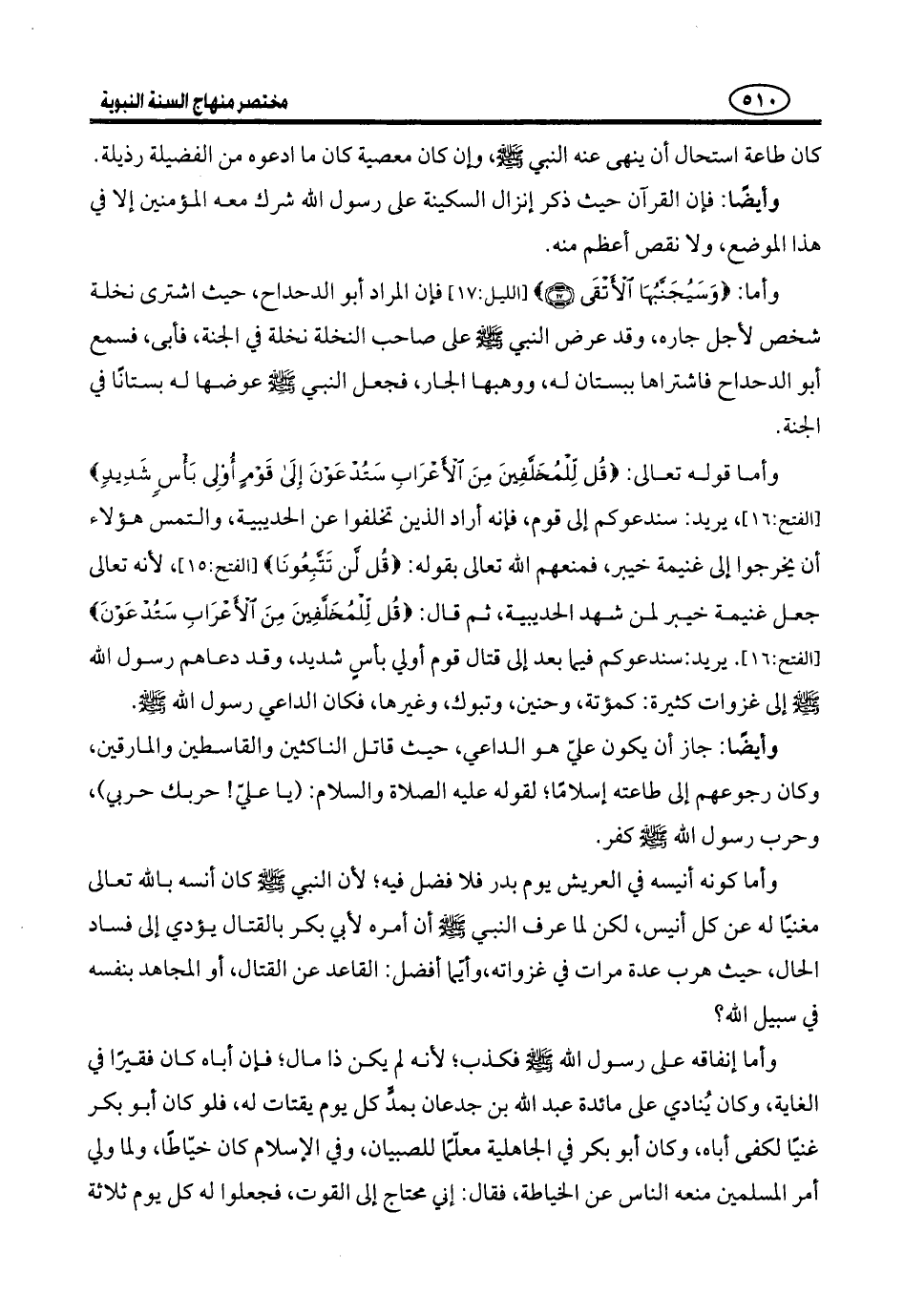 وَمِنَ الْمَعْلُومِ أَنَّ النَّبِيَّ - صَلَّى اللَّهُ عَلَيْهِ وَسَلَّمَ - أَشْرَفُ مِنَ الَّذِينَ تَصَدَّقَ عَلَيْهِمْ أَمِيرُ الْمُؤْمِنِينَ، وَالْمَالَ الَّذِي يَدَّعُونَ إِنْفَاقَهُ أَكْثَرُ، فَحَيْثُ لَمْ يَنْزِلْ فِيهِ قُرْآنٌ دَلَّ عَلَى كَذِبِ النَّقْلِ.