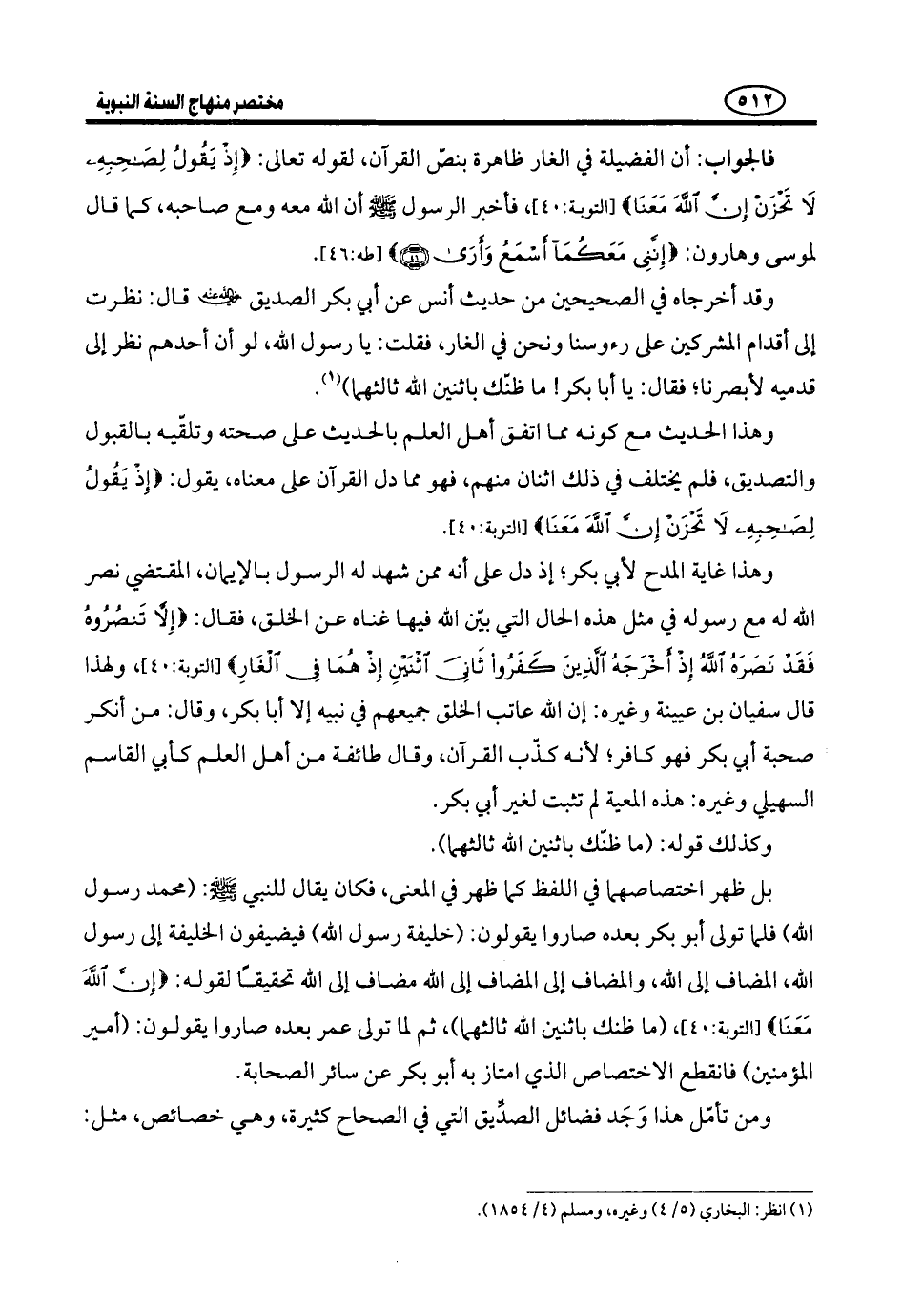 فَهَذِهِ الْأُمُورُ الَّتِي هِيَ مَقَاصِدُ الصُّحْبَةِ وَمَحَامِدُهَا، الَّتِي بِهَا يَسْتَحِقُّ الصَّحَابَةُ أَنْ يُفضَّلوا بِهَا عَلَى غَيْرِهِمْ، لِأَبِي بَكْرٍ فِيهَا مِنْ الِاخْتِصَاصِ بِقَدْرِهَا وَنَوْعِهَا وَصِفَتِهَا وَفَائِدَتِهَا ما لا يشركه فيه أحد.
