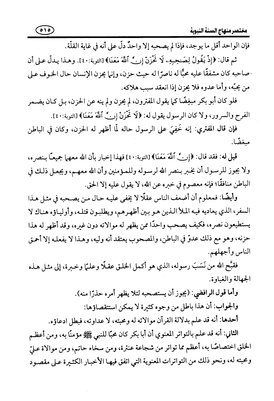 كلام من هو أَجْهَلِ النَّاسِ بِمَا وَقَعَ؛ فَإِنَّ أَمْرَ النَّبِيِّ - صَلَّى اللَّهُ عَلَيْهِ وَسَلَّمَ - فِي خُرُوجِهِ مِنْ مَكَّةَ ظَاهِرٌ، عَرَفَهُ أَهْلُ مَكَّةَ، وَأَرْسَلُوا الطَّلَبَ، فَإِنَّهُ فِي اللَّيْلَةِ الَّتِي خَرَجَ فِيهَا عَرَفُوا فِي صَبِيحَتِهَا أَنَّهُ خَرَجَ، وَانْتَشَرَ ذَلِكَ، وَأَرْسَلُوا إلى أهل الطرق يبذلون الدِّية لِمَنْ يَأْتِي بِأَبِي بَكْرٍ، دَلِيلٌ عَلَى أَنَّهُمْ كَانُوا يَعْلَمُونَ مُوَالَاتَهُ لِرَسُولِ اللَّهِ - صَلَّى اللَّهُ عَلَيْهِ وَسَلَّمَ -، وَأَنَّهُ كَانَ عَدُوَّهُمْ فِي الْبَاطِنِ، وَلَوْ كَانَ مَعَهُمْ فِي الْبَاطِنِ لَمْ يفعلوا ذلك.