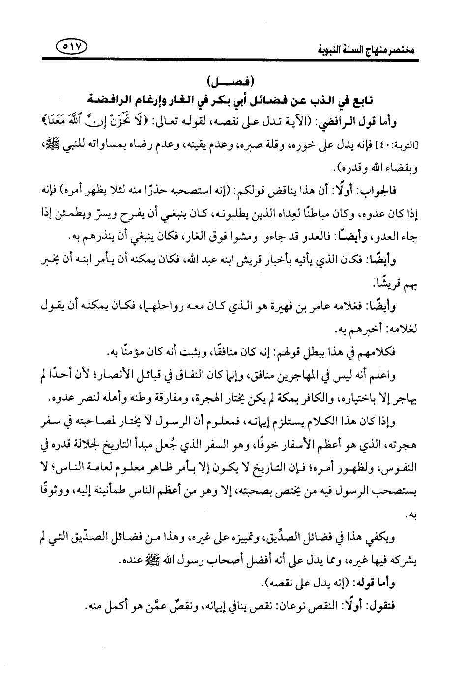 وَإِنْ أَرَادَ بِذَلِكَ أَنَّهُ نَاقِصٌ عمَّن هُوَ أَكْمَلُ مِنْهُ، فَلَا رَيْبَ أَنَّ حَالَ النَّبِيِّ - صَلَّى اللَّهُ عَلَيْهِ وَسَلَّمَ - أَكْمَلُ مِنْ حَالِ أَبِي بَكْرٍ. وَهَذَا لَا يُنَازِعُ فِيهِ أحدٌ مِنْ أَهْلِ السُّنَّةِ. وَلَكِنْ لَيْسَ فِي هَذَا مَا يَدُلُّ عَلَى أَنَّ عَلِيًّا أَوْ عُثْمَانَ أَوْ عُمَرَ أَوْ غَيْرَهُمْ أَفْضَلُ مِنْهُ، لِأَنَّهُمْ لَمْ يَكُونُوا مَعَ النَّبِيِّ - صَلَّى اللَّهُ عَلَيْهِ وَسَلَّمَ - فِي هَذِهِ الْحَالِ، ولو كانوا معه لم يُعلم حَالَهُمْ يَكُونُ أَكْمَلُ مِنْ حَالِ الصدِّيق، بَلِ الْمَعْرُوفُ مِنْ حَالِهِمْ دَائِمًا وَحَالِهِ، أَنَّهُمْ وَقْتَ الْمَخَاوِفِ يَكُونُ الصدِّيق أَكْمَلَ مِنْهُمْ كُلِّهِمْ يَقِينًا وَصَبْرًا، وَعِنْدَ وُجُودِ أَسْبَابِ الرَّيْبِ يَكُونُ الصِّدِّيقُ أعظم يقينا وطمأنينة، وعندما يَتَأَذَّى مِنْهُ النَّبِيُّ - صَلَّى اللَّهُ عَلَيْهِ وَسَلَّمَ - يَكُونُ الصِّدِّيقُ أَتْبَعَهُمْ لِمَرْضَاتِهِ، وَأَبْعَدَهُمْ عَمَّا يُؤْذِيهِ.