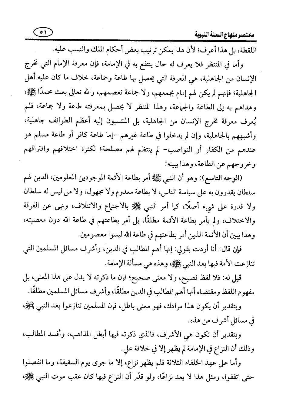 كَيْفَ وهم يسلمون أن مقصود الإمامة فِي الْفُرُوعِ الشَّرْعِيَّةِ، وَأَمَّا الْأُصُولُ الْعَقْلِيَّةُ فَلَا يُحْتَاجُ فِيهَا إِلَى الْإِمَامِ، وَتِلْكَ هِيَ أَهَمُّ وَأَشْرَفُ، ثُمَّ بَعْدَ هَذَا كُلِّهِ فَقَوْلُكُمْ فِي الْإِمَامَةِ مِنْ أَبْعَدِ الْأَقْوَالِ عَنِ الصَّوَابِ، وَلَوْ لَمْ يَكُنْ فِيهِ إِلَّا أَنَّكُمْ أَوْجَبْتُمُ الْإِمَامَةَ، لِمَا فِيهَا مِنْ مَصْلَحَةِ الْخَلْقِ، فِي دِينِهِمْ وَدُنْيَاهُمْ، وَإِمَامُكُمْ صَاحِبُ الْوَقْتِ، لَمْ يَحْصُلْ لَكُمْ مِنْ جِهَتِهِ مَصْلَحَةٌ، لَا فِي الدِّينِ وَلَا فِي الدُّنْيَا.