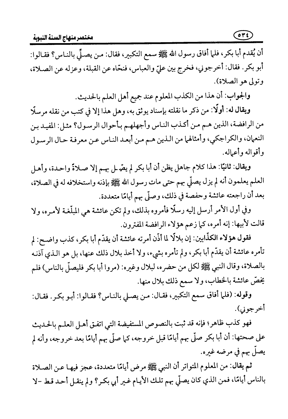 صَادِقٌ وَلَا كَاذِبٌ: أَنَّهُ صَلَّى بِهِمْ غَيْرُ أَبِي بَكْرٍ، لَا عُمَرُ وَلَا عَلِيٌّ وَلَا غَيْرُهُمَا. وَقَدْ صلُّوا جَمَاعَةً، فعُلم أَنَّ الْمُصَلِّيَ بِهِمْ كَانَ أَبَا بَكْرٍ.