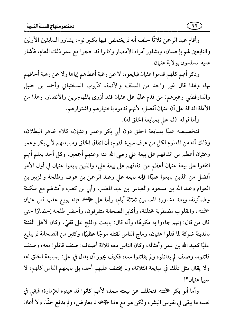 فإن قال: أردت أَنَّ أَهْلَ السُّنَّةِ يَقُولُونَ إِنَّ خِلَافَتَهُ انْعَقَدَتْ بِمُبَايَعَةِ الْخَلْقِ لَهُ، لَا بِالنَّصِّ فَلَا رَيْبَ أَنَّ أَهْلَ السُّنَّةِ وَإِنْ كَانُوا يَقُولُونَ: إِنَّ النَّصَّ عَلَى أَنَّ عَلِيًّا مِنَ الْخُلَفَاءِ الرَّاشِدِينَ لِقَوْلِهِ خِلَافَةُ النُّبُوَّةِ ثَلَاثُونَ سَنَةً، فَهُمْ يَرْوُونَ النُّصُوصَ الْكَثِيرَةَ، فِي صِحَّةِ خِلَافَةِ غَيْرِهِ وَهَذَا أمر معلوم عند أهل الحديث يَرْوُونَ، فِي صِحَّةِ خِلَافَةِ الثَّلَاثَةِ نُصُوصًا كَثِيرَةً بِخِلَافِ خِلَافَةِ عَلِيٍّ، فَإِنَّ نُصُوصَهَا قَلِيلَةٌ.