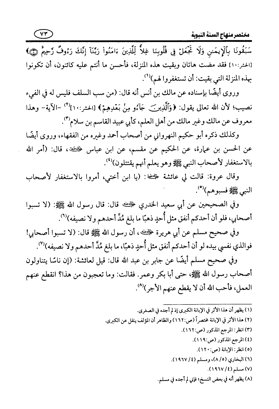 وَرَوَى ابْنُ بَطَّةَ بِالْإِسْنَادِ الصَّحِيحِ عَنْ عَبْدِ اللَّهِ بْنِ أَحْمَدَ قَالَ حَدَّثَنِي أَبِي. حَدَّثَنَا مُعَاوِيَةَ. حَدَّثَنَا رَجَاءٌ عَنْ مُجَاهِدٍ عَنِ ابْنِ عَبَّاسٍ رَضِيَ اللَّهُ عَنْهُمَا قَالَ: ((لَا تَسُبُّوا أصحاب محمد فإن الله تعالى قد أمرنا بالاستغفار لهم وهو يعلم أنهم سيقتلون)) (¬1) .