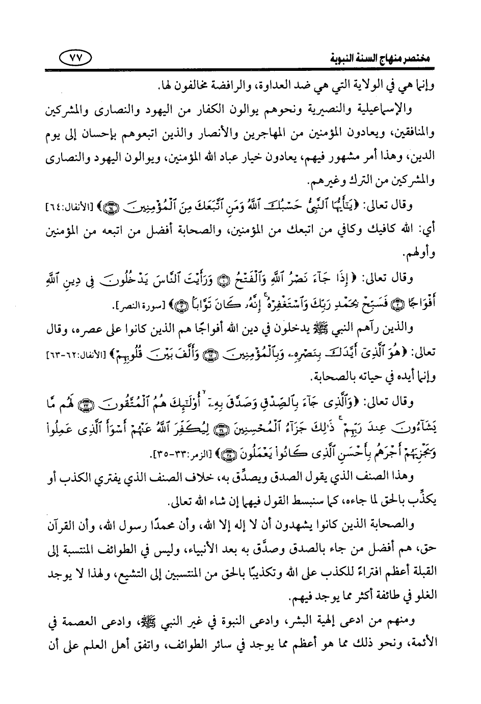 وَتَوَاتَرَ عَنِ النَّبِيِّ صَلَّى الله تعالى عَلَيْهِ وَسَلَّمَ أَنَّهُ قَالَ: ((خَيْرُ الْقُرُونِ الْقَرْنُ الذي بعثت فيه، ثُمَّ الَّذِينَ يَلُونَهُمْ، ثُمَّ الَّذِينَ يَلُونَهُمْ)) ، وَمُحَمَّدٌ صلى الله تعالى عَلَيْهِ وَسَلَّمَ وَأَصْحَابُهُ هُمُ الْمُصْطَفُونَ، مِنَ الْمُصْطَفِينَ من عباد الله وَقَالَ تَعَالَى: {ُمحمدٌ رَسُولُ اللهِ وَالَّذِينَ مَعَهُ أَشِدَّاءَ عَلَى الْكُفَّارُ رُحَمَاءَ بَيْنَهُم} (¬2) إِلَى آخَرِ السورة. وَقَالَ تَعَالَى {وَعَدَ اللهُ الَّذِينَ آمَنُوا مِنْكُمْ وَعَمِلُوا الصَّالِحَاتِ لَيَسْتَخْلِفَنَّهُم فِي الأَرْضِ كَمَا اسْتَخْلَفَ الَّذِينَ مِن قَبْلِهِم وَلَيُمَكِّنَنَّ لَهُمْ دِينَهُمُ الَّذِي ارْتَضَى لَهُم وَلَيُبْدِلَنَّهُم مِنْ بَعْدِ خَوْفِهِمْ أَمْنًا يَعْبُدُونَنِي لاَ يُشْرِكُونَ بِي شَيْئًا وَمَنْ كَفَرَ بَعْدَ ذَلِكَ فَأُوْلَئِكَ هُمُ الفَاسِقُون} (¬3) . فَقَدْ وَعَدَ اللَّهُ الَّذِينَ آمَنُوا وَعَمِلُوا الصَّالِحَاتِ بِالِاسْتِخْلَافِ، كَمَا وَعَدَهُمْ فِي تِلْكَ الْآيَةِ مَغْفِرَةً وَأَجْرًا عَظِيمًا، وَاللَّهُ لَا يُخْلِفُ الْمِيعَادَ.