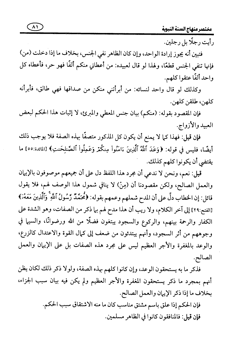 وكذا حاء فِي الْحَدِيثِ كُلُّهُمْ يَدْخُلُ الْجَنَّةَ إِلَّا صَاحِبَ الجمل الأحمر، وَبِالْجُمْلَةِ فَلَا رَيْبَ أَنَّ الْمُنَافِقِينَ كَانُوا مَغْمُورِينَ مقهورين، أذلاء، لا سيما في آخر أيام الرسول - صَلَّى اللَّهُ عَلَيْهِ وَسَلَّمَ -. وَفِي غَزْوَةِ تَبُوكَ لِأَنَّ اللَّهَ تَعَالَى قَالَ: {َيقولون لَئِنْ رَجعنا إِلَى الْمَدِينَةِ لَيَخْرُجَنَّ الأَعَزَّ مِنْهَا الأَذَلَّ وَلله العِزَّةُ َلِرَسُولِهِ وَلِلْمُؤمِنِين وِلَكِن الْمُنَافِقِينَ لاَ يَعْلَمُون} (¬4) .