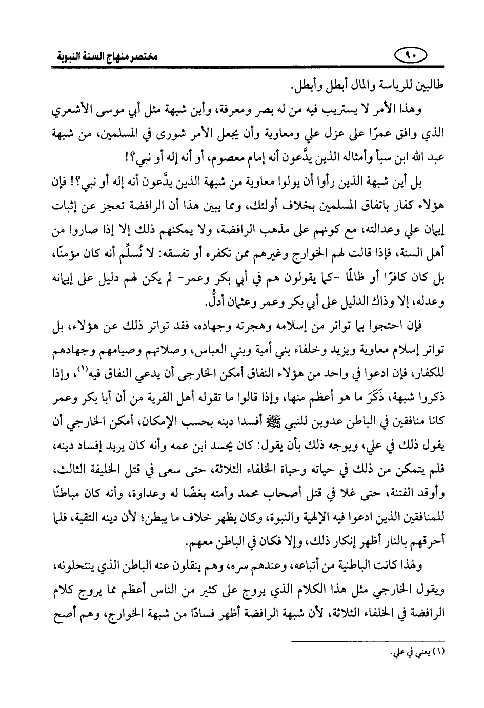 فَبَابُ الدَّعْوَى بِلَا حُجَّةٍ مُمْكِنَةٍ، وَالدَّعْوَى فِي فَضْلِ الشَّيْخَيْنِ أَمْكَنُ مِنْهَا فِي فَضْلِ غَيْرِهِمَا، وَإِنْ قَالُوا ثَبَتَ ذَلِكَ بِالنَّقْلِ والرواية، فالنقل والرواية في أولئك أكثر وأشهد، فَإِنِ ادَّعَوْا تَوَاتُرًا، فَالتَّوَاتُرُ هُنَاكَ أَصَحُّ، وَإِنِ اعْتَمَدُوا عَلَى نَقْلِ الصَّحَابَةِ فَنَقْلُهُمْ لِفَضَائِلِ أَبِي بَكْرٍ وَعُمَرَ أَكْثَرُ، ثُمَّ هُمْ يَقُولُونَ: إِنِ الصَّحَابَةَ ارْتَدُوا إِلَّا نَفَرًا قَلِيلًا فَكَيْفَ تُقْبَلُ رِوَايَةُ هَؤُلَاءِ فِي فَضِيلَةِ أَحَدٍ، وَلَمْ يَكُنْ فِي الصَّحَابَةِ رَافِضَةٌ كَثِيرُونَ، يَتَوَاتَرُ نَقْلُهُمْ، فَطَرِيقُ النقل مقطوعا عَلَيْهِمْ، إِنْ لَمْ يَسْلُكُوا طَرِيقَ أَهْلِ السُّنَّةِ، كَمَا هُوَ مَقْطُوعٌ عَلَى النَّصَارَى فِي إِثْبَاتِ نُبُوَّةِ الْمَسِيحِ إِنْ لَمْ يَسْلُكُوا طَرِيقَ الْمُسْلِمِينَ.