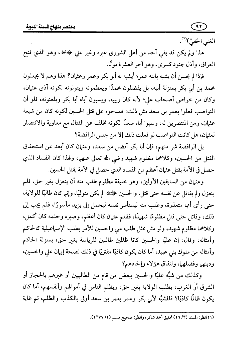 وَهَذَا بَابٌ مُطَّرِدٌ لَا تَجِدُ أَحَدًا مِمَّنْ تَذُمُّهُ الشِّيعَةُ بِحَقٍّ أَوْ بَاطِلٍ إِلَّا وَفِيهِمْ مَنْ هُوَ شَرٌّ مِنْهُ، وَلَا تَجِدُ أَحَدًا مِمَّنْ تَمْدَحُهُ الشِّيعَةُ إِلَّا وَفِيمَنْ تَمْدَحُهُ الْخَوَارِجُ مَنْ هُوَ خَيْرٌ مِنْهُ، فَإِنَّ الرَّوَافِضَ شَرٌّ مِنَ النَّوَاصِبِ، وَالَّذِينَ تُكَفِّرُهُمْ أَوْ تُفَسِّقُهُمُ الرَّوَافِضُ، هُمْ أَفْضَلُ مِنَ الَّذِينَ تُكَفِّرُهُمْ أَوْ تُفَسِّقُهُمُ النَّوَاصِبُ.