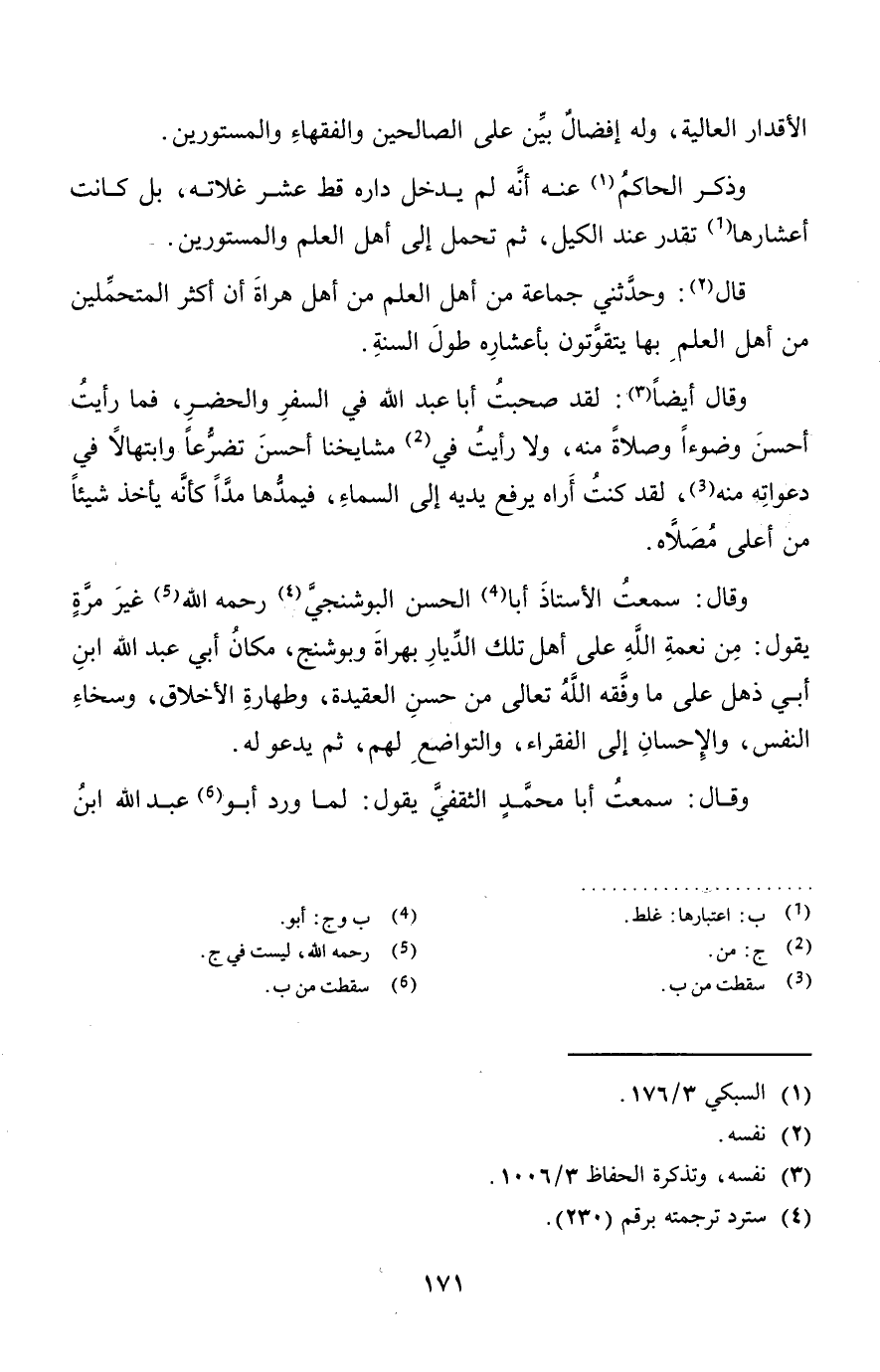 وَقَالَ: سَمِعت الْأُسْتَاذ أَبَا الْحسن البوشنجي رَحمَه الله غير مرّة يَقُول: من نعْمَة الله على أهل تِلْكَ الديار بهراة وبوشنج، مَكَان أبي عبد الله ابْن أبي ذهل على مَا وَفقه الله تَعَالَى من حسن العقيدة، وطهارة الْأَخْلَاق، وسخاء النَّفس، وَالْإِحْسَان إِلَى الْفُقَرَاء، والتواضع لَهُم، ثمَّ يَدْعُو لَهُ