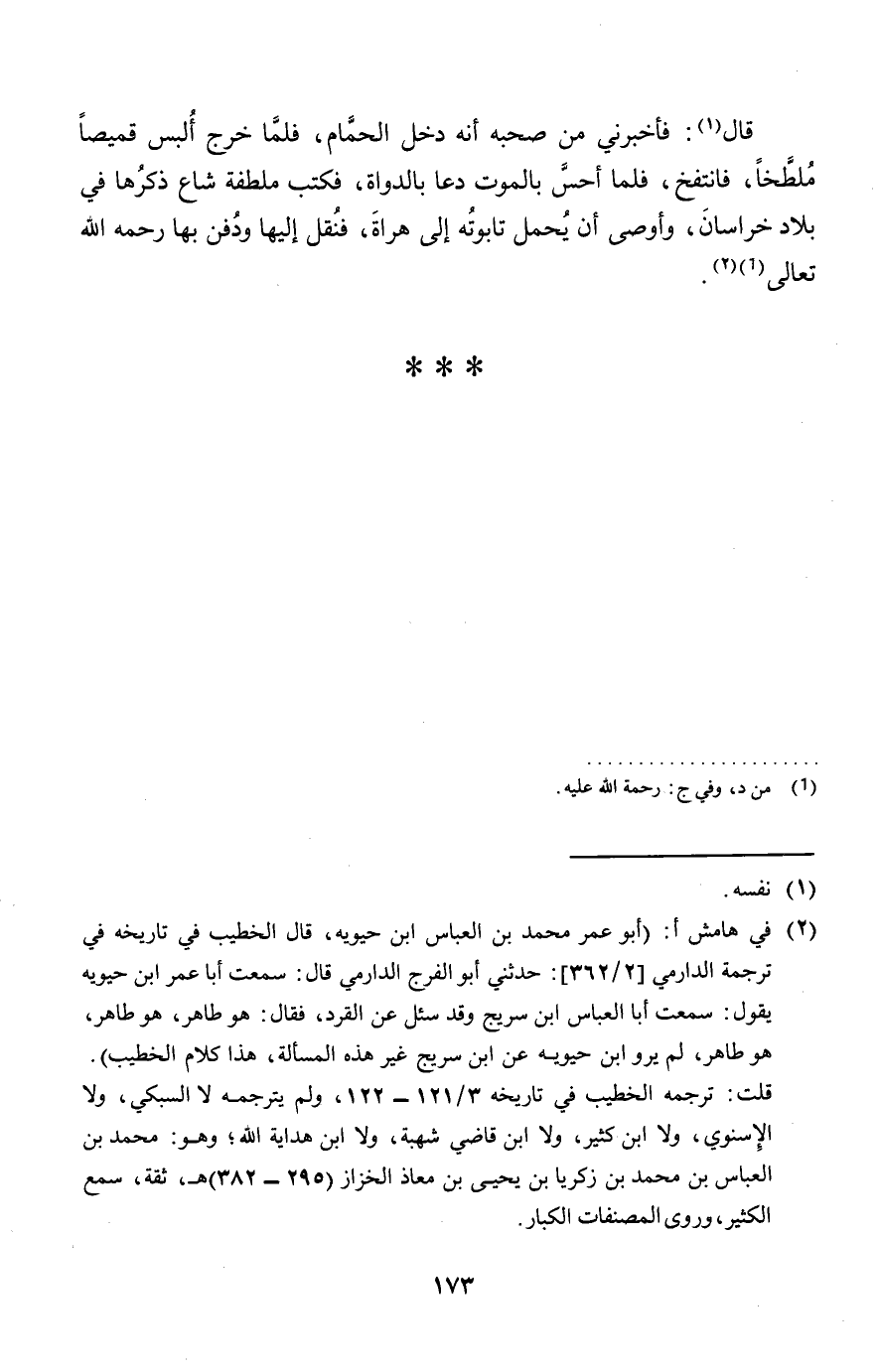 قَالَ: فَأَخْبرنِي من صَحبه أَنه دخل الْحمام، فَلَمَّا خرج ألبس قَمِيصًا مُلَطَّخًا، فانتفخ، فَلَمَّا أحس بِالْمَوْتِ دَعَا بالدواة، فَكتب ملطفة شاع ذكرهَا فِي بِلَاد خُرَاسَان، وَأوصى أَن يحمل تابوته إِلَى هراة، فَنقل إِلَيْهَا وَدفن بهَا رَحمَه الله تَعَالَى.