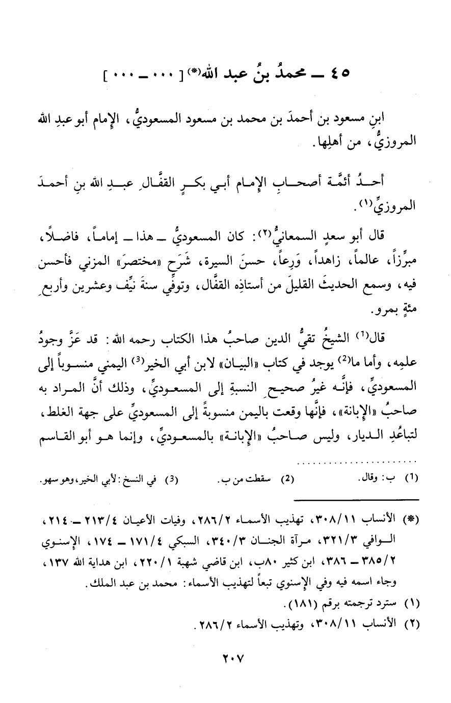 قَالَ الشَّيْخ تَقِيّ الدّين صَاحب هَذَا الْكتاب رَحمَه الله: قد عز وجود علمه، وَأما مَا يُوجد فِي كتاب " الْبَيَان " لِابْنِ أبي الْخَيْر اليمني مَنْسُوبا إِلَى المَسْعُودِيّ، فَإِنَّهُ غير صَحِيح النِّسْبَة إِلَى المَسْعُودِيّ، وَذَلِكَ أَن المُرَاد بِهِ صَاحب " الْإِبَانَة "، فَإِنَّهَا وَقعت بِالْيمن منسوبة إِلَى المَسْعُودِيّ على جِهَة الْغَلَط، لتباعد الديار، وَلَيْسَ صَاحب " الْإِبَانَة " بالمسعودي، وَإِنَّمَا هُوَ أَبُو الْقَاسِم