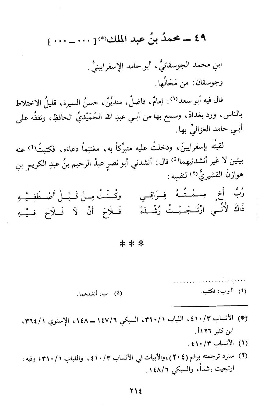لَقيته بإسفرايين، وَدخلت عَلَيْهِ متبركا بِهِ، مغتنما دعاءه، فَكتبت عَنهُ بَيْتَيْنِ لَا غير أنشدنيهما قَالَ: أَنْشدني أَبُو نصر عبد الرَّحِيم بن عبد الْكَرِيم بن هوَازن الْقشيرِي لنَفسِهِ: