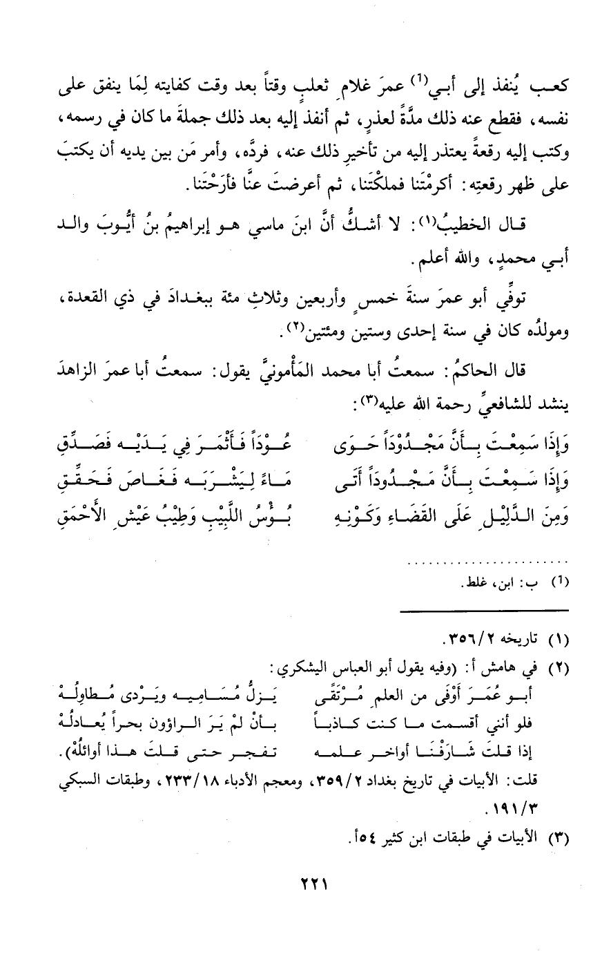 قَالَ الْحَاكِم: سَمِعت أَبَا مُحَمَّد المأموني يَقُول: سَمِعت أَبَا عمر الزَّاهِد ينشد للشَّافِعِيّ رَحْمَة الله عَلَيْهِ: