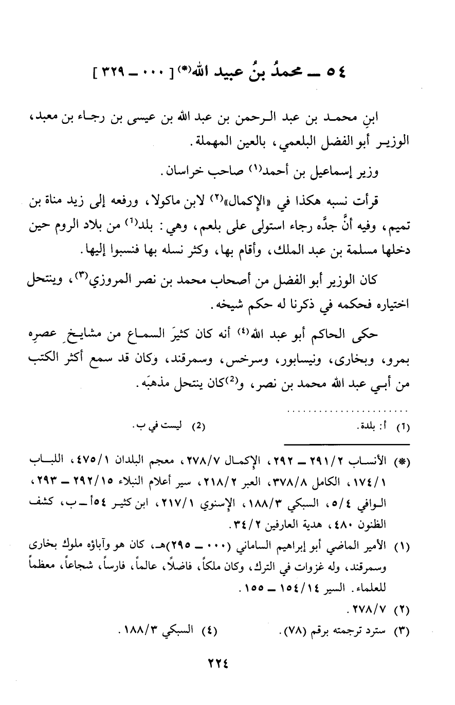 ابْن مُحَمَّد بن عبد الرَّحْمَن بن عبد الله بن عِيسَى بن رَجَاء بن معبد، الْوَزير أَبُو الْفضل البلعمي، بِالْعينِ الْمُهْملَة.