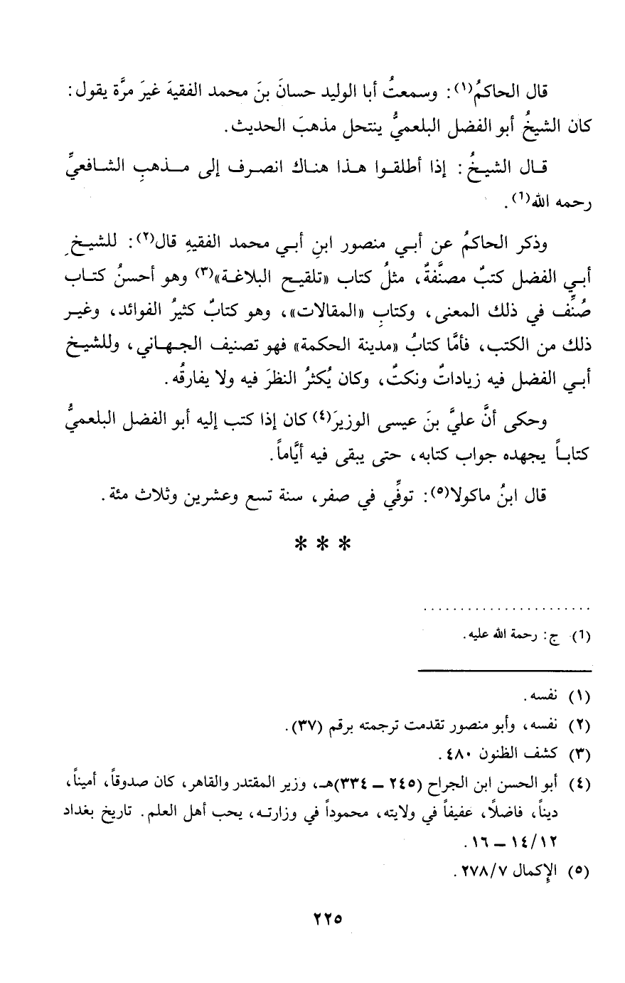 قَالَ الْحَاكِم: وَسمعت أَبَا الْوَلِيد حسان بن مُحَمَّد الْفَقِيه غير مرّة يَقُول: كَانَ الشَّيْخ أَبُو الْفضل البلعمي ينتحل مَذْهَب الحَدِيث.