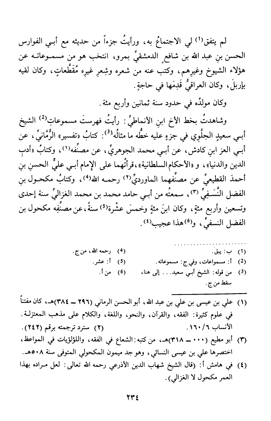 وشاهدت بِخَط الْأَخ ابْن الانماطي: رَأَيْت فهرست مسموعات الشَّيْخ أبي سعيد الحلوي فِي جُزْء عَلَيْهِ خطه مَا مِثَاله: كتاب " تَفْسِير " الرماني، عَن أبي الْعِزّ ابْن كادش، عَن أبي مُحَمَّد الْجَوْهَرِي، عَن مُصَنفه، وَكتاب " أدب الدّين وَالدُّنْيَا "، و " الْأَحْكَام السُّلْطَانِيَّة "، قرأتهما على الإِمَام أبي عَليّ الْحسن بن أَحْمد الْقطيعِي عَن مصنفهما الْمَاوَرْدِيّ رَحمَه الله، وَكتاب مَكْحُول بن الْفضل النَّسَفِيّ، سمعته من أبي حَامِد مُحَمَّد بن مُحَمَّد الْغَزالِيّ سنة إِحْدَى وَتِسْعين وَأَرْبع مئة، وَكَانَ ابْن مئة وَخمْس عشرَة سنة، عَن مُصَنفه مَكْحُول بن الْفضل النَّسَفِيّ، وَهَذَا عَجِيب.