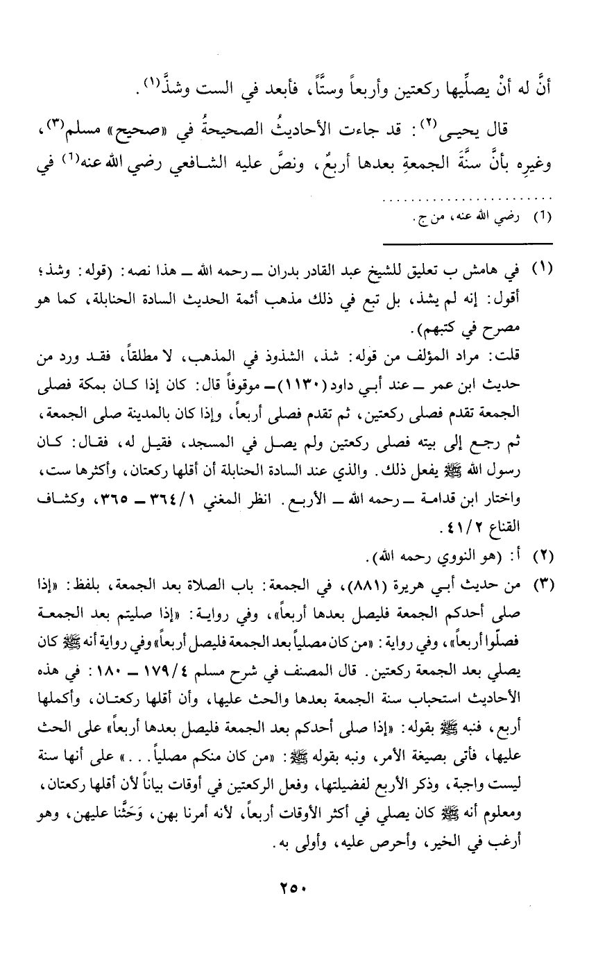 قَالَ يحيى: قد جَاءَت الْأَحَادِيث الصَّحِيحَة فِي " صَحِيح " مُسلم، وَغَيره بِأَن سنة الْجُمُعَة بعْدهَا أَربع، وَنَصّ عَلَيْهِ الشَّافِعِي رَضِي الله عَنهُ فِي