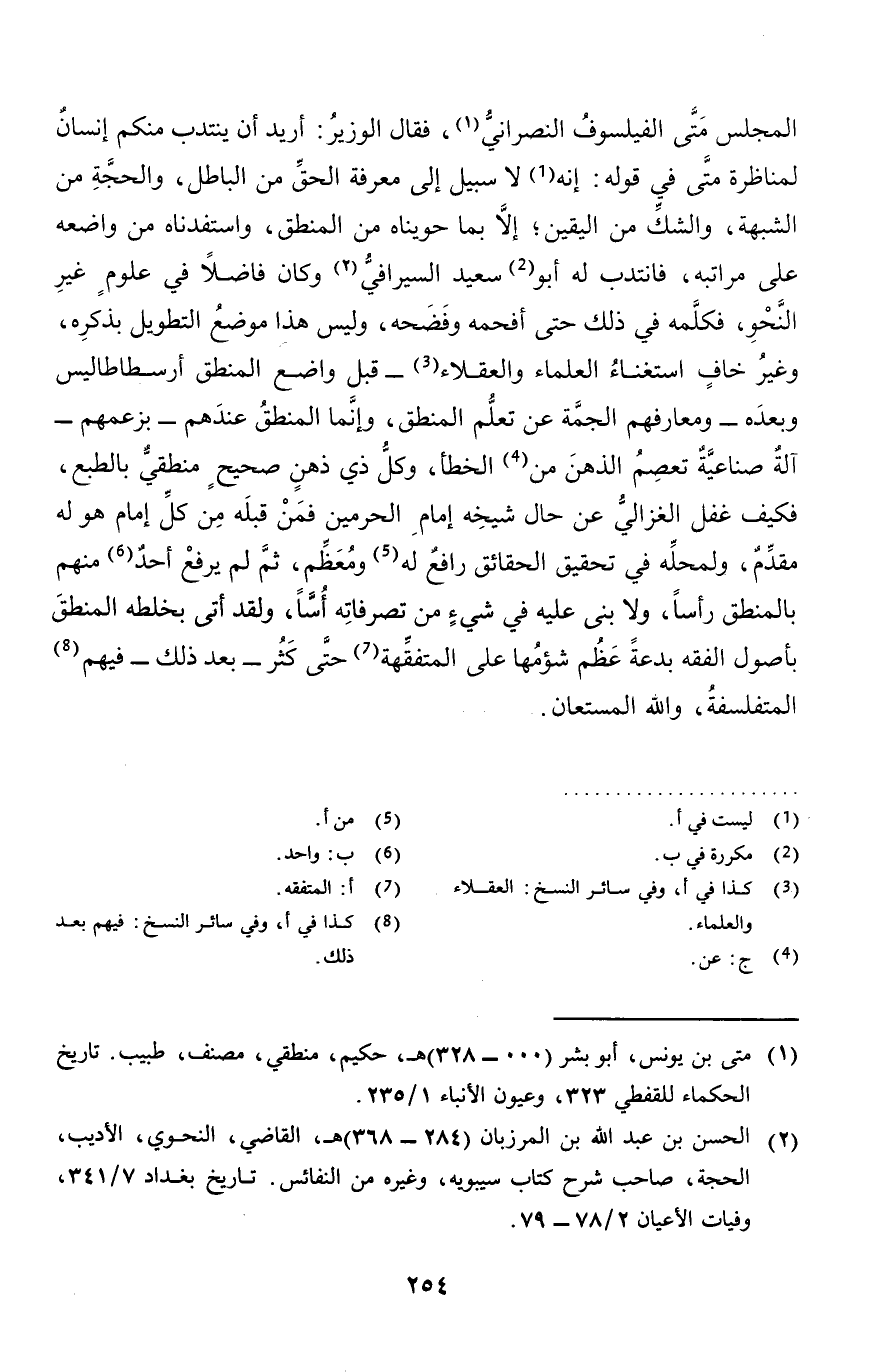 الْمجْلس مَتى الفيلسوف النَّصْرَانِي، فَقَالَ الْوَزير: أُرِيد أَن ينتدب مِنْكُم إِنْسَان لمناظرة مَتى فِي قَوْله: إِنَّه لَا سَبِيل إِلَى معرفَة الْحق من الْبَاطِل، وَالْحجّة من الشُّبْهَة، وَالشَّكّ من الْيَقِين؛ إِلَّا بِمَا حويناه من الْمنطق، واستفدناه من وَاضعه على مراتبه، فَانْتدبَ لَهُ أَبُو سعيد السيرافي وَكَانَ فَاضلا فِي عُلُوم غير النَّحْو، فَكَلمهُ فِي ذَلِك حَتَّى أَفْحَمَهُ وفضحه، وَلَيْسَ هَذَا مَوضِع التَّطْوِيل بِذكرِهِ، وَغير خَافَ اسْتغْنَاء الْعلمَاء والعقلاء - قبل وَاضع الْمنطق أرسطاطاليس وَبعده - ومعارفهم الجمة عَن تعلم الْمنطق، وَإِنَّمَا الْمنطق عِنْدهم - بزعمهم - آلَة صناعية تعصم الذِّهْن من الْخَطَأ، وكل ذِي ذهن صَحِيح منطقي بالطبع، فَكيف غفل الْغَزالِيّ عَن حَال شَيْخه إِمَام الْحَرَمَيْنِ فَمن قبله من كل إِمَام هُوَ لَهُ مقدم، ولمحله فِي تَحْقِيق الْحَقَائِق رَافع لَهُ ومعظم، ثمَّ لم يرفع أحد مِنْهُم بالْمَنْطق رَأْسا، وَلَا بنى عَلَيْهِ فِي شَيْء من تَصَرُّفَاته أسا، وَلَقَد أَتَى بخلطه الْمنطق بأصول الْفِقْه بِدعَة عظم شؤمها على المتفقهة حَتَّى كثر - بعد ذَلِك - فيهم المتفلسفة، وَالله الْمُسْتَعَان.