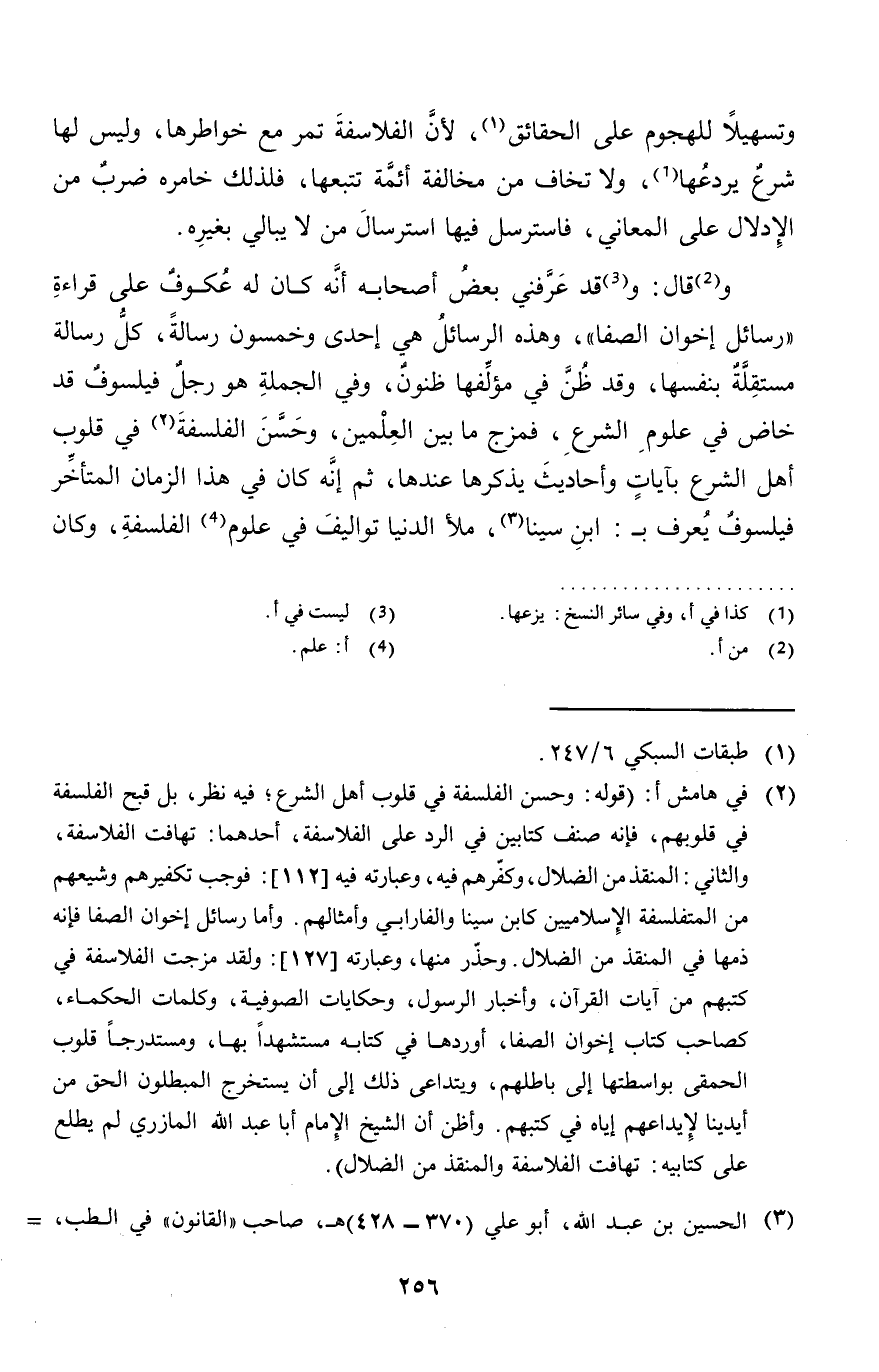 وَقَالَ: وَقد عرفني بعض أَصْحَابه أَنه كَانَ لَهُ عكوف على قِرَاءَة " رسائل إخْوَان الصَّفَا "، وَهَذِه الرسائل هِيَ إِحْدَى وَخَمْسُونَ رِسَالَة، كل رِسَالَة مُسْتَقلَّة بِنَفسِهَا، وَقد ظن فِي مؤلفها ظنون، وَفِي الْجُمْلَة هُوَ رجل فيلسوف قد خَاضَ فِي عُلُوم الشَّرْع، فمزج مَا بَين العلمين، وَحسن الفلسفة فِي قُلُوب أهل الشَّرْع بآيَات وَأَحَادِيث يذكرهَا عِنْدهَا، ثمَّ إِنَّه كَانَ فِي هَذَا الزَّمَان الْمُتَأَخر فيلسوف يعرف ب: ابْن سينا، مَلأ الدُّنْيَا تواليف فِي عُلُوم الفلسفة، وَكَانَ