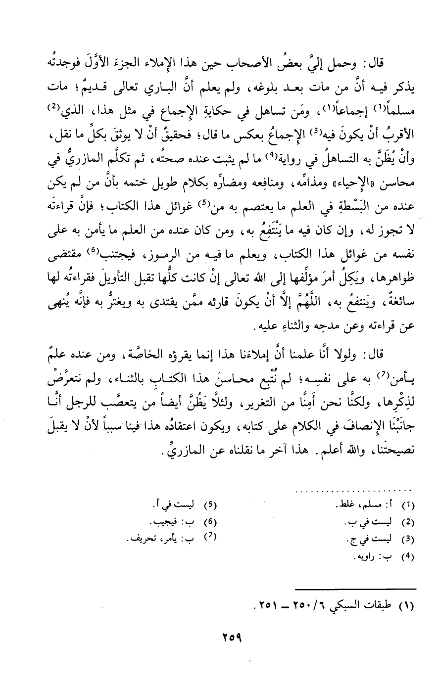 قَالَ: وَلَوْلَا أَنا علمنَا أَن إملاءنا هَذَا إِنَّمَا يَقْرَؤُهُ الْخَاصَّة، وَمن عِنْده علم يَأْمَن بِهِ على نَفسه؛ لم نتبع محَاسِن هَذَا الْكتاب بالثناء، وَلم نتعرض لذكرها، وَلَكنَّا نَحن أمنا من التَّغْرِير، وَلِئَلَّا يظنّ أَيْضا من يتعصب للرجل أَنا جانبنا الْإِنْصَاف فِي الْكَلَام على كِتَابه، وَيكون اعْتِقَاده هَذَا فِينَا سَببا لِأَن لَا يقبل نصيحتنا، وَالله أعلم. هَذَا آخر مَا نَقَلْنَاهُ عَن الْمَازرِيّ.