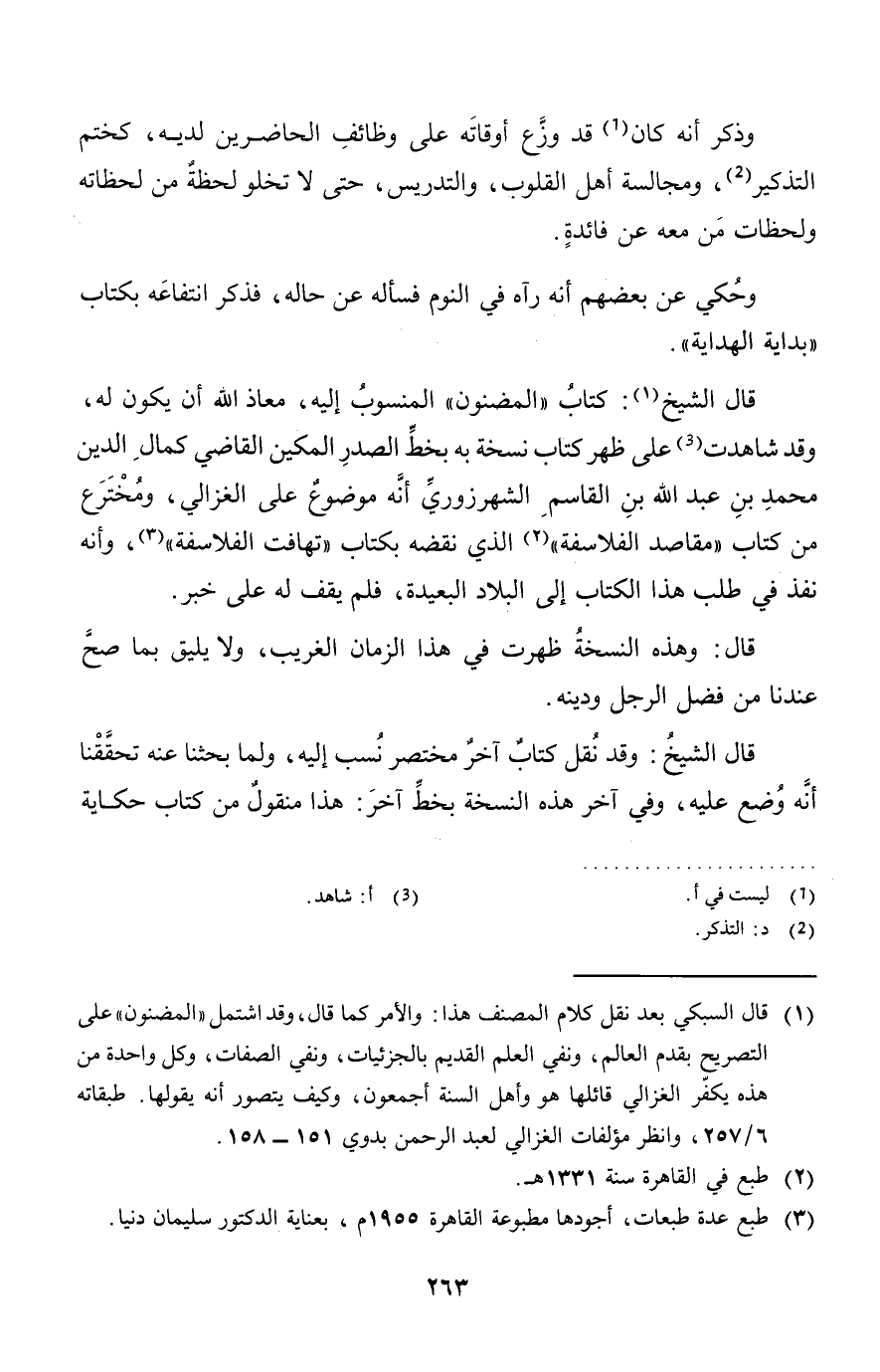قَالَ الشَّيْخ: كتاب " المضنون " الْمَنْسُوب إِلَيْهِ، معَاذ الله أَن يكون لَهُ، وَقد شاهدت على ظهر كتاب نُسْخَة بِهِ بِخَط الصَّدْر المكين القَاضِي كَمَال الدّين مُحَمَّد بن عبد الله بن الْقَاسِم الشهرزوري أَنه مَوْضُوع على الْغَزالِيّ، ومخترع من كتاب " مَقَاصِد الفلاسفة " الَّذِي نقضه بِكِتَاب " تهافت الفلاسفة "، وَأَنه نفذ فِي طلب هَذَا الْكتاب إِلَى الْبِلَاد الْبَعِيدَة، فَلم يقف لَهُ على خبر.