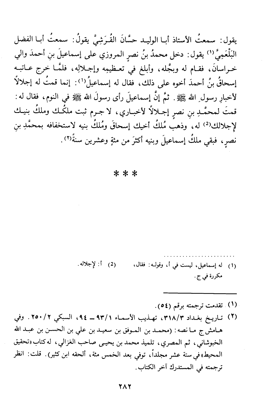 يَقُول: سَمِعت الْأُسْتَاذ أَبَا الْوَلِيد حسان الْقرشِي يَقُول: سَمِعت أَبَا الْفضل البلعمي يَقُول: دخل مُحَمَّد بن نصر الْمروزِي على إِسْمَاعِيل بن أَحْمد وَالِي خُرَاسَان، فَقَامَ لَهُ وبجله، وأبلغ فِي تَعْظِيمه وإجلاله، فَلَمَّا خرج عاتبه إِسْحَاق بن أَحْمد أَخُوهُ على ذَلِك، فَقَالَ لَهُ إِسْمَاعِيل: إِنَّمَا قُمْت لَهُ إجلالا لأخبار رَسُول الله صلى الله عَلَيْهِ وَسلم. ثمَّ إِن إِسْمَاعِيل رأى رَسُول الله صلى الله عَلَيْهِ وَسلم فِي النّوم، فَقَالَ لَهُ: قُمْت لمُحَمد بن نصر إجلالا لأخباري، لَا جرم ثَبت ملكك وَملك بنيك لإجلالك لَهُ، وَذهب ملك أَخِيك إِسْحَاق وَملك بنيه لاستخفافه بِمُحَمد بن نصر، فَبَقيَ ملك إِسْمَاعِيل وبنيه أَكثر من مئة وَعشْرين سنة.