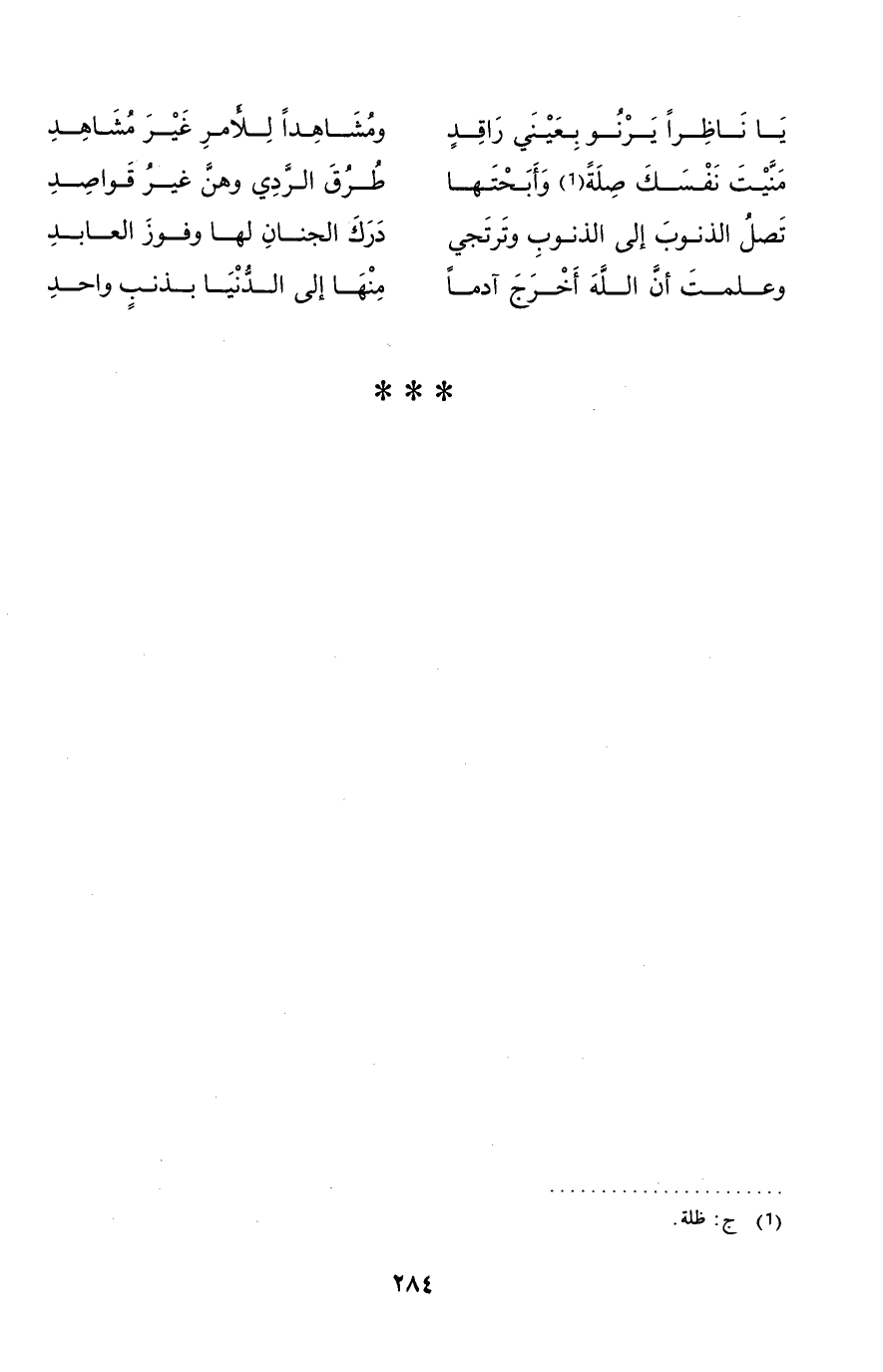 (تصل الذُّنُوب إِلَى الذُّنُوب وترتجي ... دَرك الْجنان لَهَا وَفَوْز العابد)