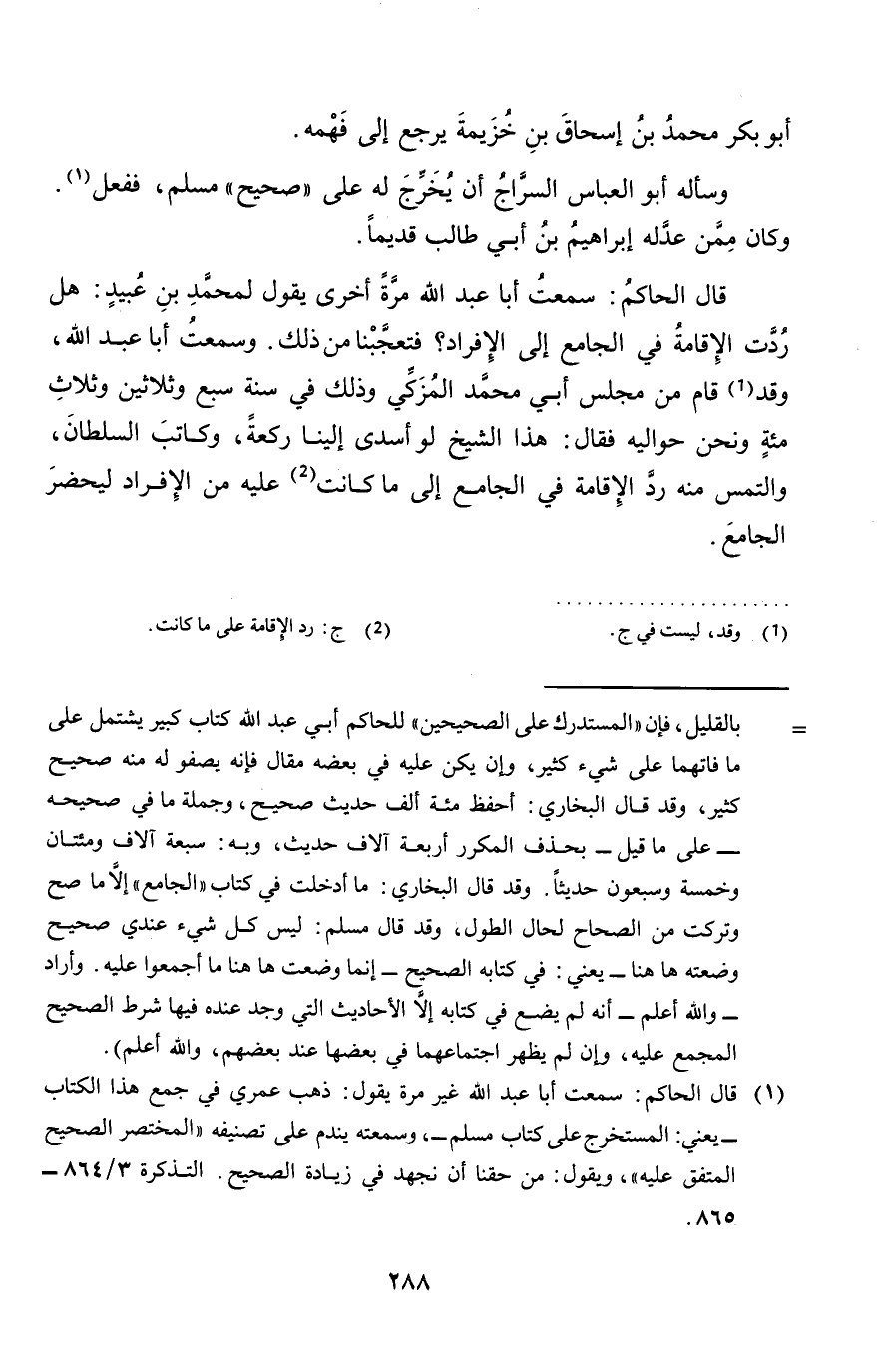 قَالَ الْحَاكِم: سَمِعت أَبَا عبد الله مرّة أُخْرَى يَقُول لمُحَمد بن عبيد: هَل ردَّتْ الْإِقَامَة فِي الْجَامِع إِلَى الْإِفْرَاد؟ فتعجبنا من ذَلِك. وَسمعت أَبَا عبد الله، وَقد قَامَ من مجْلِس أبي مُحَمَّد الْمُزَكي وَذَلِكَ فِي سنة سبع وَثَلَاثِينَ وَثَلَاث مئة وَنحن حواليه فَقَالَ: هَذَا الشَّيْخ لَو أسدى إِلَيْنَا رَكْعَة، وَكَاتب السُّلْطَان، وَالْتمس مِنْهُ رد الْإِقَامَة فِي الْجَامِع إِلَى مَا كَانَت عَلَيْهِ من الْإِفْرَاد ليحضر الْجَامِع.