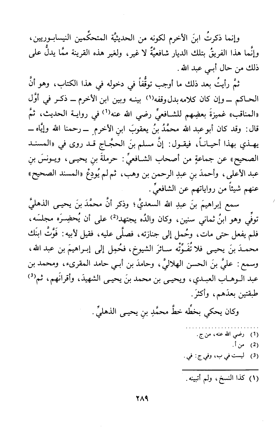 ثمَّ رَأَيْت بعد ذَلِك مَا أوجب توقفا فِي دُخُوله فِي هَذَا الْكتاب، وَهُوَ أَن الْحَاكِم - وَإِن كَانَ كَلَامه بدل وَقفه بَينه وَبَين ابْن الأخرم - ذكر فِي أول " المناقب " غميزة بَعضهم للشَّافِعِيّ رَضِي الله عَنهُ فِي رِوَايَة الحَدِيث، ثمَّ قَالَ: وَقد كَانَ أَبُو عبد الله مُحَمَّد بن يَعْقُوب ابْن الأخرم - رحمنا الله وإياه - يهذي بِهَذَا أَحْيَانًا، فَيَقُول: إِن مُسلم بن الْحجَّاج قد روى فِي " الْمسند الصَّحِيح " عَن جمَاعَة من أَصْحَاب الشَّافِعِي: حَرْمَلَة بن يحيى، وَيُونُس بن عبد الْأَعْلَى، وَأحمد بن عبد الرَّحْمَن بن وهب، ثمَّ لم يودع " الْمسند الصَّحِيح " عَنْهُم شَيْئا من رواياتهم عَن الشَّافِعِي.