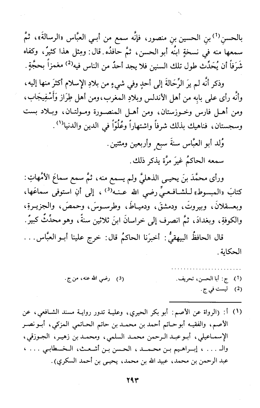 بالْحسنِ بن الْحُسَيْن بن مَنْصُور، فَإِنَّهُ سمع من أبي الْعَبَّاس " الرسَالَة "، ثمَّ سَمعهَا مِنْهُ فِي نُسْخَة ابْنه أَبُو الْحسن، ثمَّ حافده. قَالَ: وَمثل هَذَا كثير، وَكَفاهُ شرفا أَن يحدث طول تِلْكَ السنين فَلَا يجد أحد من النَّاس فِيهِ مغمزا بِحجَّة.