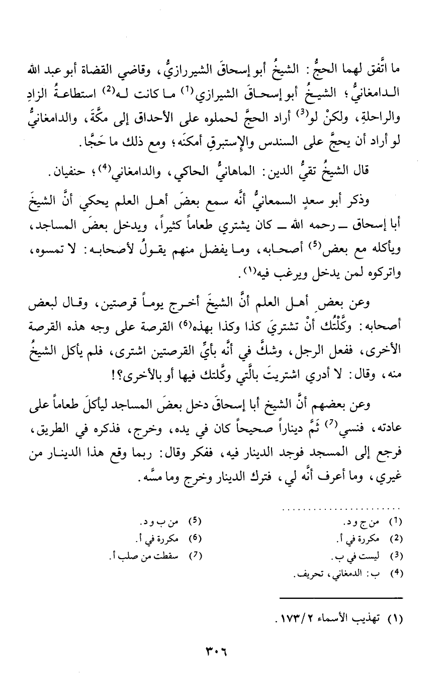 مَا اتّفق لَهما الْحَج: الشَّيْخ أَبُو إِسْحَاق الشِّيرَازِيّ، وقاضي الْقُضَاة أَبُو عبد الله الدَّامغَانِي؛ الشَّيْخ أَبُو إِسْحَاق الشِّيرَازِيّ مَا كَانَت لَهُ استطاعة الزَّاد وَالرَّاحِلَة، وَلَكِن لَو أَرَادَ الْحَج لحملوه على الأحداق إِلَى مَكَّة، والدامغاني لَو اراد أَن يحجّ على السندس والإستبرق أمكنه؛ وَمَعَ ذَلِك مَا حجا.