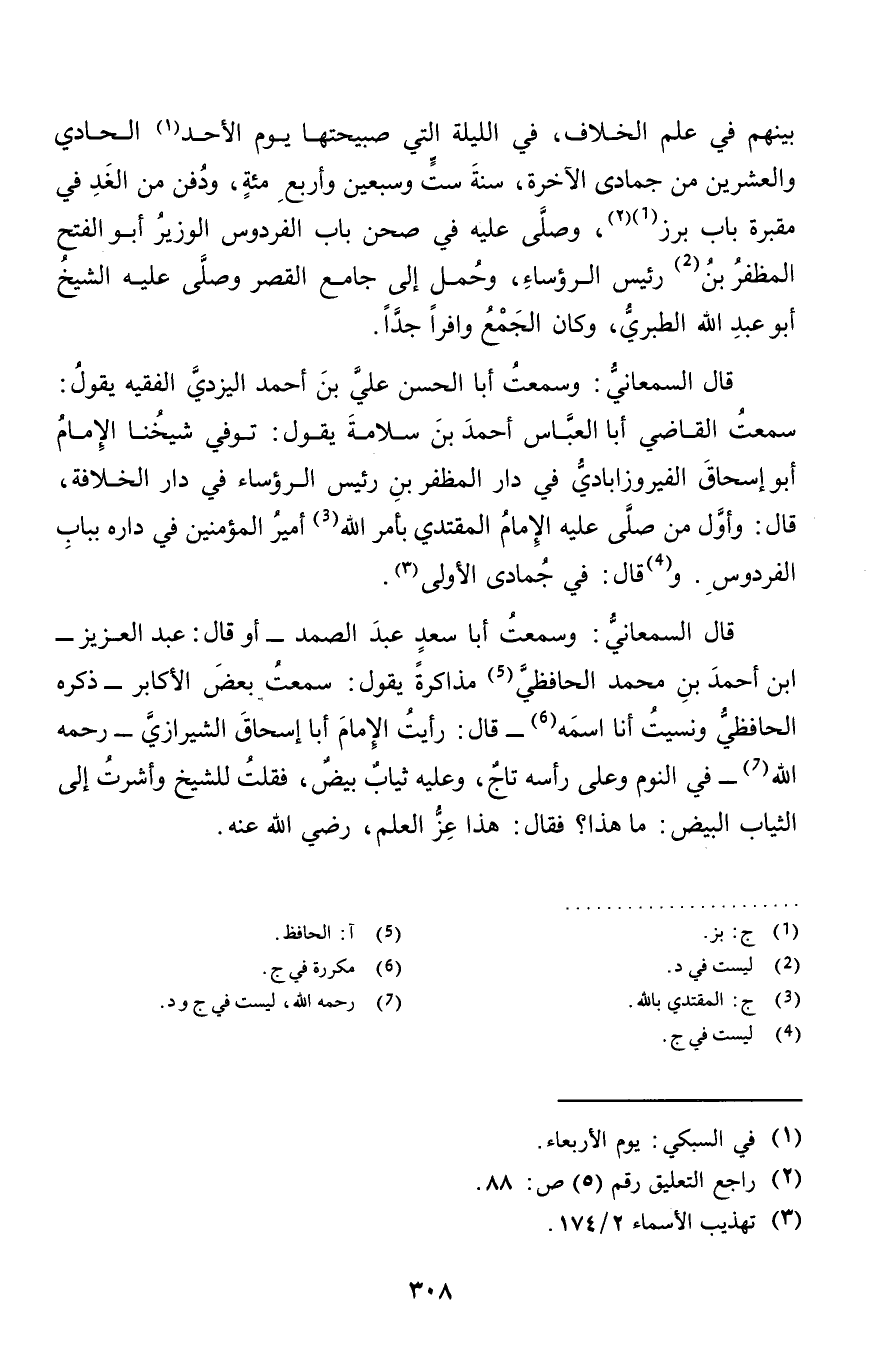 بَينهم فِي علم الْخلاف، فِي اللَّيْلَة الَّتِي صبيحتها يَوْم الْأَحَد الْحَادِي وَالْعِشْرين من جُمَادَى الْآخِرَة، سنة سِتّ وَسبعين وَأَرْبع مئة، وَدفن من الْغَد فِي مقرة بَاب برز، وَصلى عَلَيْهِ فِي صحن بَاب الفردوس الْوَزير أَبُو الْفَتْح المظفر بن رَئِيس الرؤساء، وَحمل إِلَى جَامع الْقصر وَصلى عَلَيْهِ الشَّيْخ أَبُو عبد الله الطَّبَرِيّ، وَكَانَ الْجمع وافرا جدا.