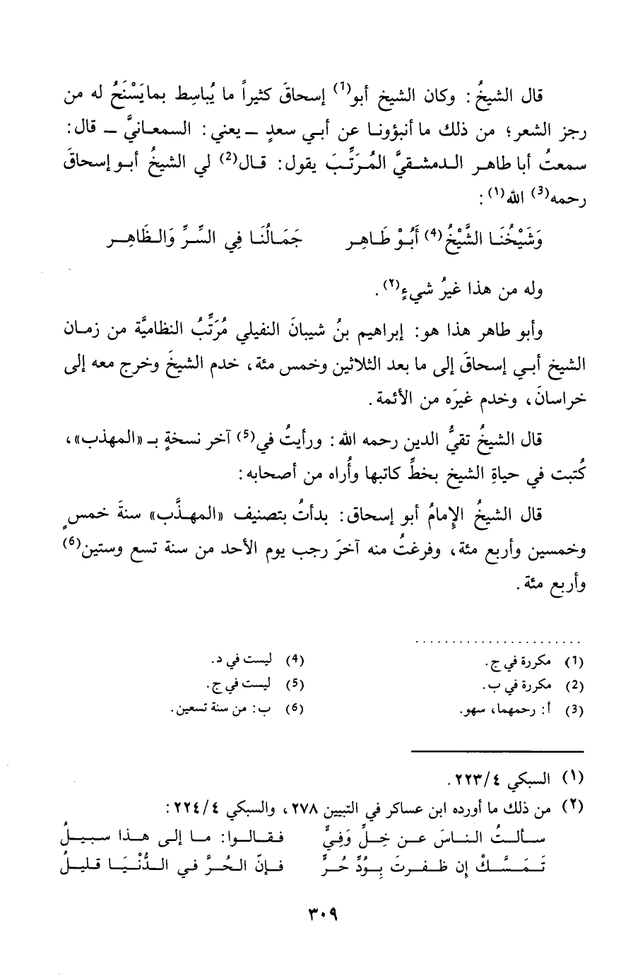 قَالَ الشَّيْخ: وَكَانَ الشَّيْخ أَبُو إِسْحَاق كثيرا مَا يباسط بِمَا يسنح لَهُ من رجز الشّعْر؛ من ذَلِك مَا أنبؤونا عَن أبي سعد - يَعْنِي: السَّمْعَانِيّ - قَالَ: سَمِعت أَبَا طَاهِر الدِّمَشْقِي الْمُرَتّب يَقُول: قَالَ لي الشَّيْخ أَبُو إِسْحَاق رَحمَه الله: