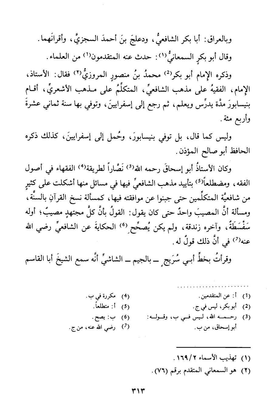 وَذكره الإِمَام أَبُو بكر مُحَمَّد بن مَنْصُور الْمروزِي فَقَالَ: الْأُسْتَاذ، الإِمَام، الْفَقِيه على مَذْهَب الشَّافِعِي، الْمُتَكَلّم على مَذْهَب الْأَشْعَرِيّ، أَقَامَ بنيسابور مُدَّة يدرس وَيعلم، ثمَّ رَجَعَ إِلَى إسفرايين، وَتُوفِّي بهَا سنة ثَمَانِي عشرَة وَأَرْبع مئة.