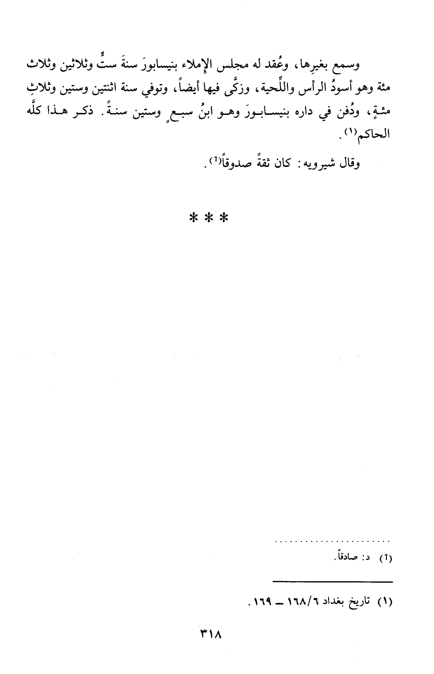 وَسمع بغَيْرهَا، وَعقد لَهُ مجْلِس الْإِمْلَاء بنيسابور سنة سِتّ وَثَلَاثِينَ وَثَلَاث مئة وَهُوَ أسود الرَّأْس واللحية، وزكى فِيهَا أَيْضا، وَتُوفِّي سنة اثْنَتَيْنِ وَسِتِّينَ وَثَلَاث مئة، وَدفن فِي دَاره بنيسابور وَهُوَ ابْن سبع وَسِتِّينَ سنة. ذكر هَذَا كُله الْحَاكِم.