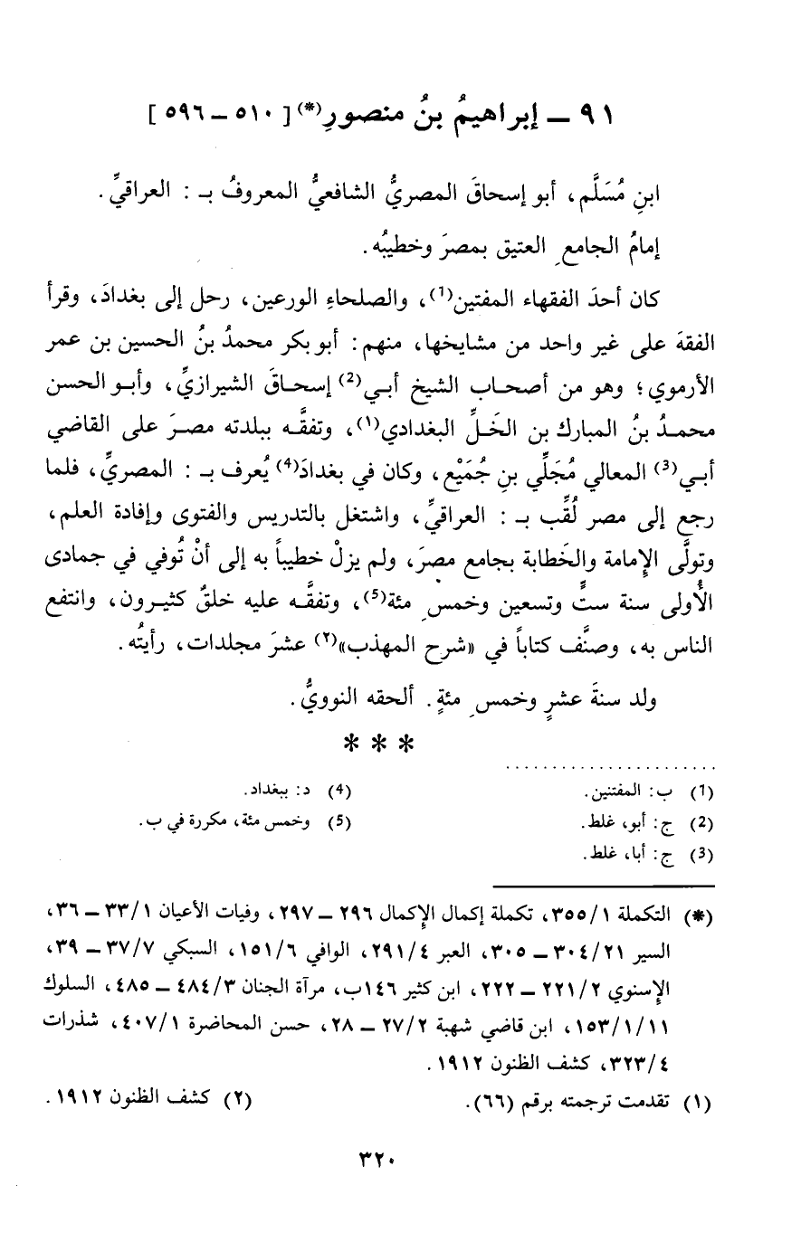 كَانَ أحد الْفُقَهَاء الْمُفْتِينَ، والصلحاء الورعين، رَحل إِلَى بَغْدَاد، وَقَرَأَ الْفِقْه على غير وَاحِد من مشايخها، مِنْهُم: أَبُو بكر مُحَمَّد بن الْحُسَيْن بن عمر الارموي؛ وَهُوَ من أَصْحَاب الشَّيْخ أبي إِسْحَاق الشِّيرَازِيّ، وَأَبُو الْحسن مُحَمَّد بن الْمُبَارك بن الْخلّ الْبَغْدَادِيّ، وتفقه ببلدته مصر على القَاضِي أبي الْمَعَالِي مجلي بن جَمِيع، وَكَانَ فِي بَغْدَاد يعرف ب: الْمصْرِيّ، فَلَمَّا رَجَعَ إِلَى مصر لقب ب: الْعِرَاقِيّ، واشتغل بالتدريس وَالْفَتْوَى وإفادة الْعلم، وَتَوَلَّى الْإِمَامَة والخطابة بِجَامِع مصر، وَلم يزل خَطِيبًا بِهِ إِلَى توفّي فِي جُمَادَى الأولى سنة سِتّ وَتِسْعين وَخمْس مئة، وتفقه عَلَيْهِ خلق كَثِيرُونَ، وانتفع النَّاس بِهِ، وصنف كتابا فِي " شرح الْمُهَذّب " عشر مجلدات، رَأَيْته. ولد سنة عشر وَخمْس مئة. ألحقهُ النَّوَوِيّ.