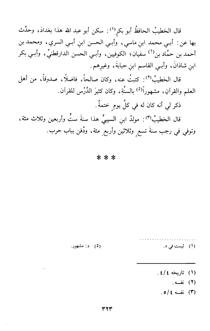 قَالَ الْخَطِيب: كتبت عَنهُ، وَكَانَ صَالحا، فَاضلا، صَدُوقًا، من أهل الْعلم وَالْقُرْآن، مَشْهُورا بِالسنةِ، وَكَانَ كثير الدَّرْس لِلْقُرْآنِ. " ذكر لي أَنه كَانَ لَهُ فِي كل يَوْم ختمة.