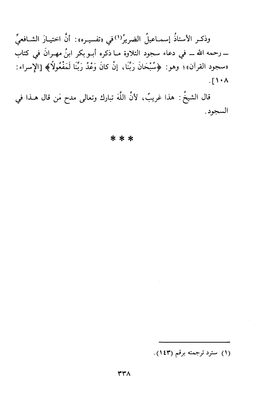 وَذكر الاستاذ إِسْمَاعِيل الضَّرِير فِي " تَفْسِيره ": أَن اخْتِيَار الشَّافِعِي - رَحمَه الله - فِي دُعَاء سُجُود التِّلَاوَة مَا ذكره أَبُو بكر ابْن مهْرَان فِي كتاب " سُجُود الْقُرْآن "؛ وَهُوَ: {سُبْحَانَ رَبنَا إِن كَانَ وعد رَبنَا لمفعولا} [الْإِسْرَاء: 108] .
