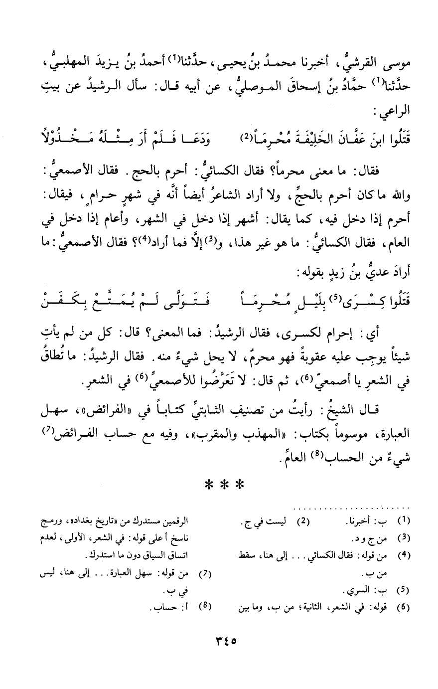 فَقَالَ: مَا معنى محرما؟ فَقَالَ الْكسَائي: أحرم بِالْحَجِّ. فَقَالَ الْأَصْمَعِي: وَالله مَا كَانَ أحرم بِالْحَجِّ، وَلَا أَرَادَ الشَّاعِر أَيْضا أَنه فِي شهر حرَام، فَيُقَال: أحرم إِذا دخل فِيهِ، كَمَا يُقَال: أشهر إِذا دخل فِي الشَّهْر، وأعام إِذا دخل فِي الْعَام، فَقَالَ الْكسَائي: مَا هُوَ غير هَذَا، وَإِلَّا فَمَا أَرَادَ؟ فَقَالَ الْأَصْمَعِي: مَا أَرَادَ عدي بن زيد بقوله:
