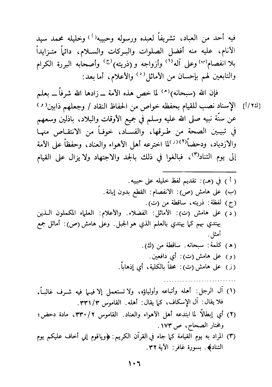 فيه أحد من العباد، تشريفًا لعبده ورسوله وحبيبه (أ) وخليله محمد سيد الأنام، عليه منه أفضل الصلوات والبركات والسلام، دائمًا متزايدًا بلا انفصام (ب) وعلى آله (¬1) وأزواجه و (ذريته) (ج) وأصحابه البررة الكرام والتابعين لهم بإحسان من الأماثل (د) والأعلام، أما بعد: