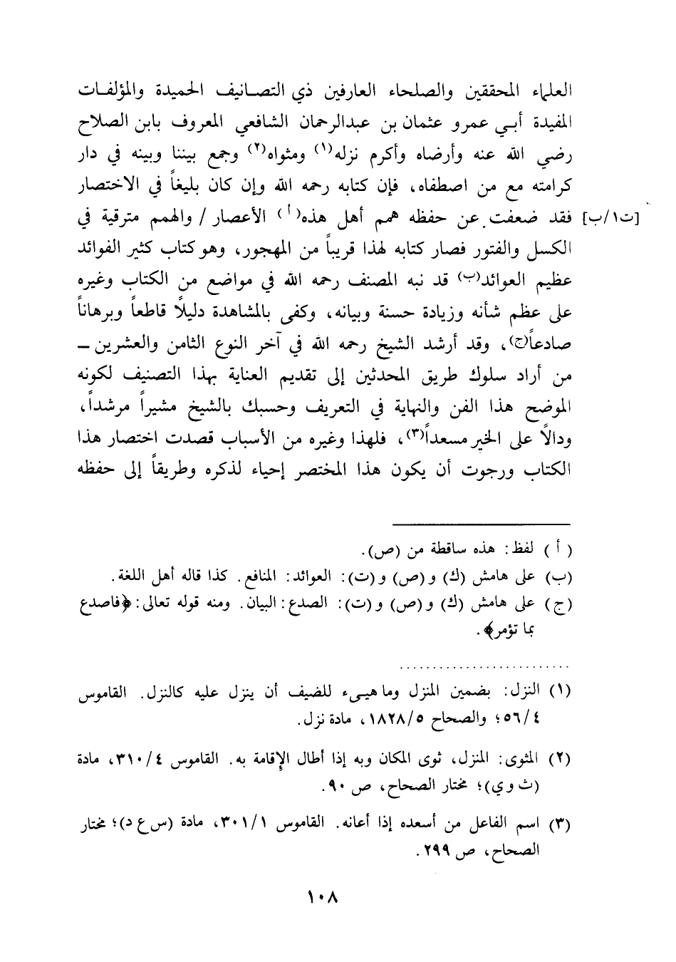 العلماء المحققين والصلحاء العارفين ذي التصانيف الحميدة والمؤلفات المفيدة أبي عمرو عثمان بن عبد الرحمان الشافعي المعروف بابن الصلاح رضي الله عنه وأرضاه وأكرم نزله (¬1) ومثواه (¬2) وجمع بيننا وبينه في دار كرامته مع من اصطفاه، فإن كتابه رحمه الله وإن كان بليغًا في الاختصار فقد ضعفت عن حفظه همم أهل هذه (أ) الأعصار والهمم مترقية في الكسل والفتور فصار كتابه لهذا قريبًا من المهجور، وهو كتاب كثير الفوائد عظيم العوائد (ب) قد نبه المصنف رحمه الله في مواضع من الكتاب وغيره على عظم شأنه وزيادة حسنة وبيانه، وكفى بالمشاهدة دليلًا قاطعًا وبرهانًا صادعًا (ج)، وقد أرشد الشيخ رحمه الله في آخر النوع الثامن والعشرين - من أراد سلوك طريق المحدثين إلى تقديم العناية بهذا التصنيف لكونه الموضح هذا الفن والنهاية في التعريف وحسبك بالشيخ مشيرًا مرشدًا، ودالًا على الخير مسعدًا (¬3)، فلهذا وغيره من الأسباب قصدت اختصار هذا الكتاب ورجوت أن يكون هذا المختصر إحياء لذكره وطريقًا إلى حفظه