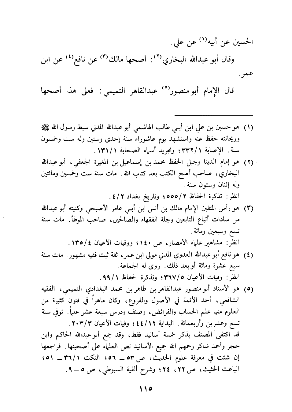 قد اكتفى المصنف بذكر خمسة أسانيد فقط، وقد جمع أبو عبد الله الحاكم وابن حجر وأحمد شاكر رحمهم الله جميع الأسانيد نص العلماء على أصحيتها. فراجعها إن شئت في معرفة علوم الحديث، ص 53 - 56؛ النكت 1/ 36 - 51؛ الباعث الحثيث، ص 22، 24؛ وشرح ألفية السيوطي، ص 5 - 9.