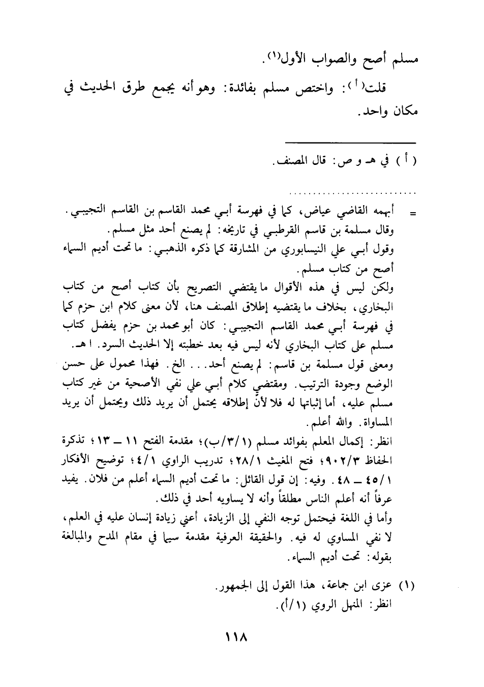 انظر: إكمال المعلم بفوائد مسلم (1/ 3/ ب)؛ مقدمة الفتح 11 - 13؛ تذكرة الحفاظ 3/ 902؛ فتح المغيث 1/ 28؛ تدريب الراوي 1/ 4؛ توضيح الأفكار 1/ 45 - 48. وفيه: إن قول القائل: ما تحت أديم السماء أعلم من فلان. يفيد عرفًا أنه أعلم الناس مطلقًا وأنه لا يساويه أحد في ذلك.