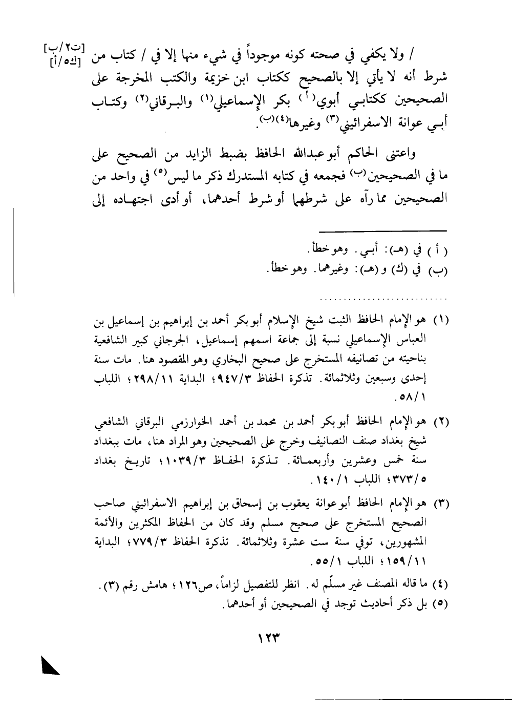 (¬1) هو الإِمام الحافظ الثبت شيخ الإِسلام أبو بكر أحمد بن إبراهيم بن إسماعيل بن العباس الإِسماعيلي نسبة إلى جماعة اسمهم إسماعيل، الجرجاني كبير الشافعية بناحيته من تصانيفه المستخرج على صحيح البخاري وهو المقصود هنا. مات سنة إحدى وسبعين وثلاثمائة. تذكرة الحفاظ 3/ 947؛ البداية 11/ 298؛ اللباب 1/ 58.