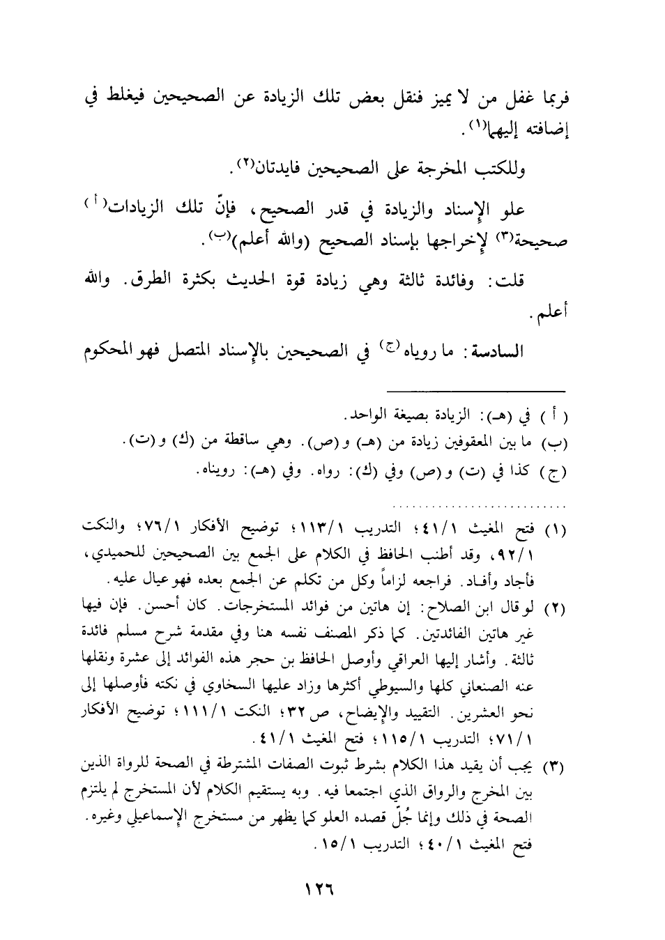 علو الإِسناد والزيادة في قدر الصحيح، فإنّ تلك الزيادات (أ) صحيحة (¬3) لإِخراجها بإسناد الصحيح (والله أعلم) (ب).