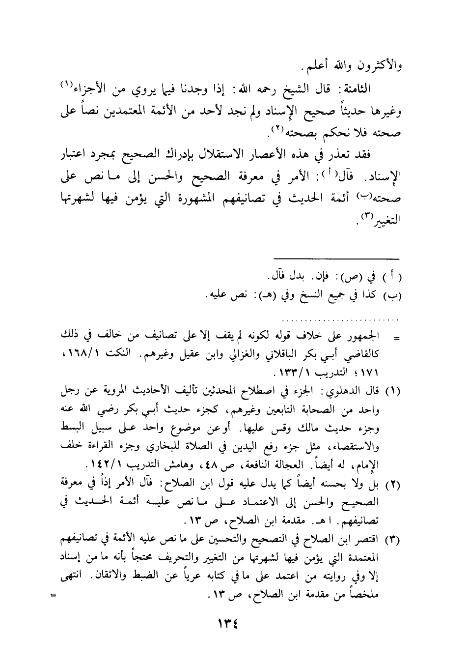 فقد تعذر في هذه الأعصار الاستقلال بإدراك الصحيح بمجرد اعتبار الإِسناد. فآل (أ): الأمر في معرفة الصحيح والحسن إلى ما نص على صحته (ب) أئمة الحديث في تصانيفهم المشهورة التي يؤمن فيها لشهرتها التغيير (¬3).