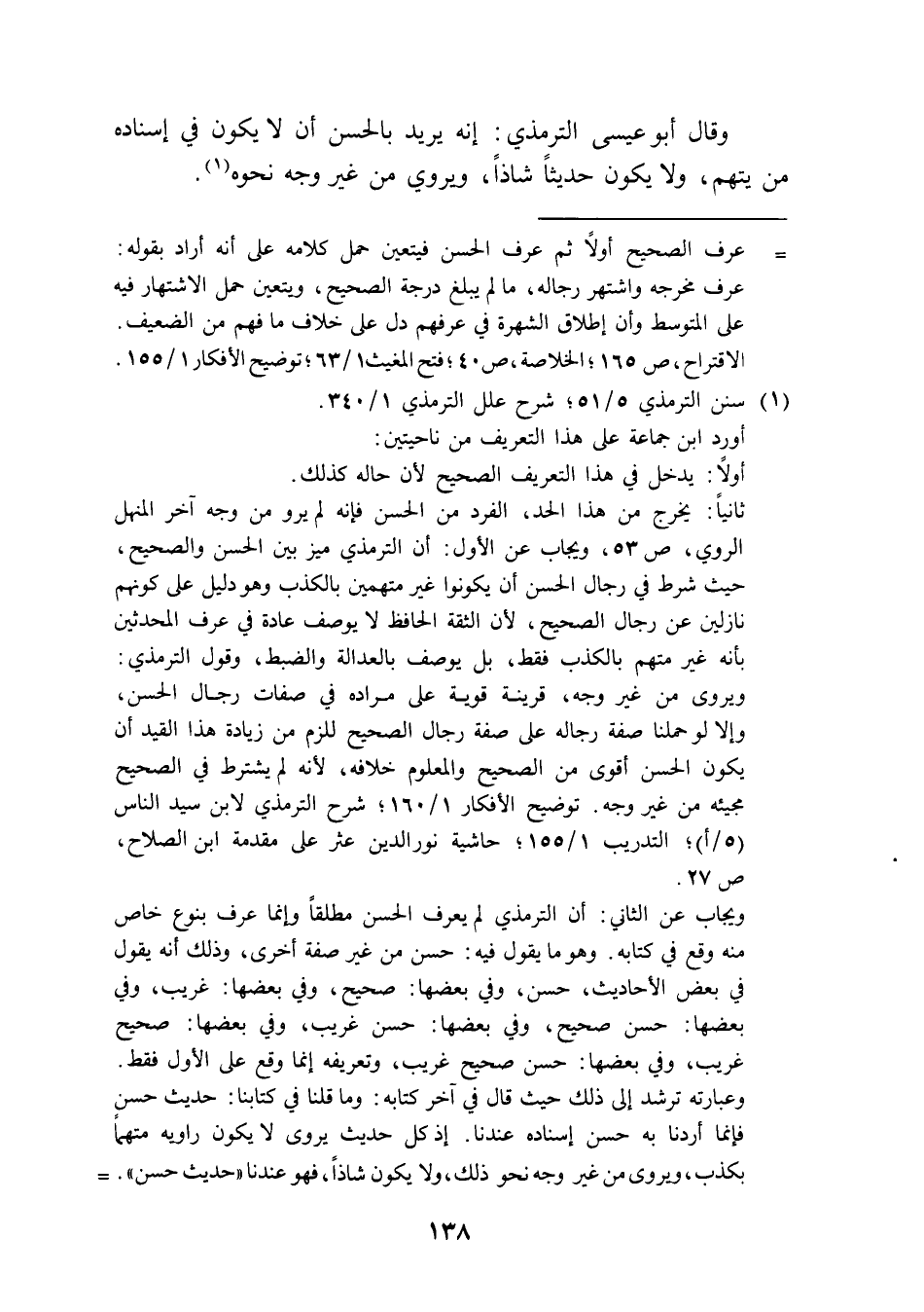 ثانيًا: يخرج من هذا الحد، الفرد من الحسن فإنه لم يرو من وجه آخر المنهل الروي، ص 53، ويجاب عن الأول: أن الترمذي ميز بين الحسن والصحيح، حيث شرط في رجال الحسن أن يكونوا غير متهمين بالكذب وهو دليل على كونهم نازلين عن رجال الصحيح، لأن الثقة الحافظ لا يوصف عادة في عرف المحدثين بأنه غير متهم بالكذب فقط، بل يوصف بالعدالة والضبط، وقول الترمذي: ويروى من غير وجه، قرينة قوية على مراده في صفات رجال الحسن، وإلا لو حملنا صفة رجاله على صفة رجال الصحيح للزم من زيادة هذا القيد أن يكون الحسن أقوى من الصحيح والمعلوم خلافه، لأنه لم يشترط في الصحيح مجيئه من غير وجه. توضيح الأفكار 1/ 160؛ شرح الترمذي لابن سيد الناس (5/ أ)؛ التدريب 1/ 155؛ حاشية نور الدين عثر على مقدمة ابن الصلاح، ص 27.