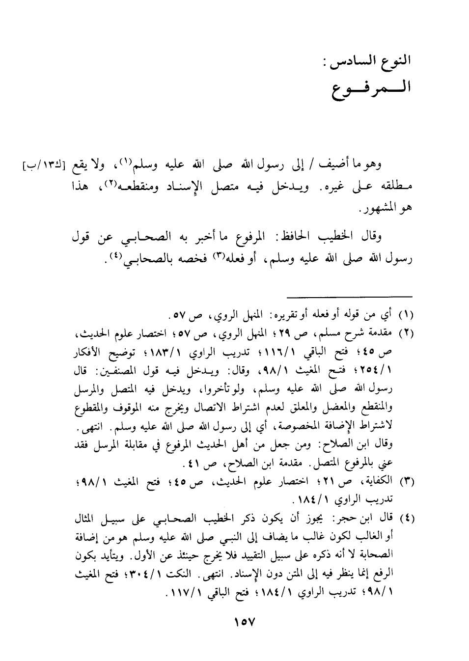 (¬2) مقدمة شرح مسلم، ص 29؛ المنهل الروي، ص 57؛ اختصار علوم الحديث، ص 45؛ فتح الباقي 1/ 116؛ تدريب الراوي 1/ 183؛ توضيح الأفكار 1/ 254؛ فتح المغيث 1/ 98، وقال: ويدخل فيه قول المصنفين: قال رسول الله صلى الله عليه وسلم، ولو تأخروا، ويدخل فيه المتصل والمرسل والمنقطع والمعضل والمعلق لعدم اشتراط الاتصال ويخرج منه الموقوف والمقطوع لاشتراط الإضافة المخصوصة، أي إلى رسول الله صلى الله عليه وسلم. انتهى. وقال ابن الصلاح: ومن جعل من أهل الحديث المرفوع في مقابلة المرسل فقد عني بالمرفوع المتصل. مقدمة ابن الصلاح، ص 41.