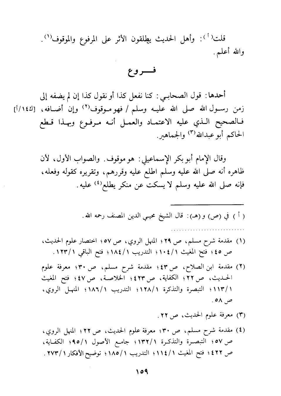 (¬4) مقدمة شرح مسلم، ص 30؛ معرفة علوم الحديث، ص 22؛ المنهل الروي، ص 57؛ التبصرة والتذكرة 1/ 132؛ جامع الأصول 1/ 95؛ الكفاية، ص 422؛ فتح المغيث 1/ 114؛ التدريب 1/ 185؛ توضيح الأفكار 1/ 273.
